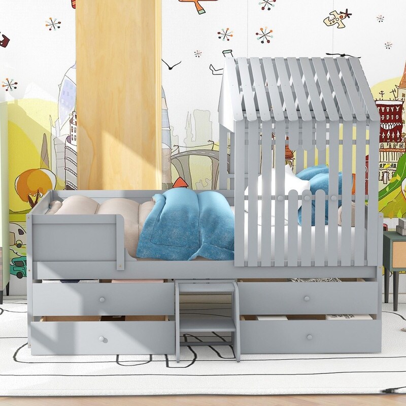 Wooden Grey House Bed with Trundle and 3-Drawer,Twin Size
