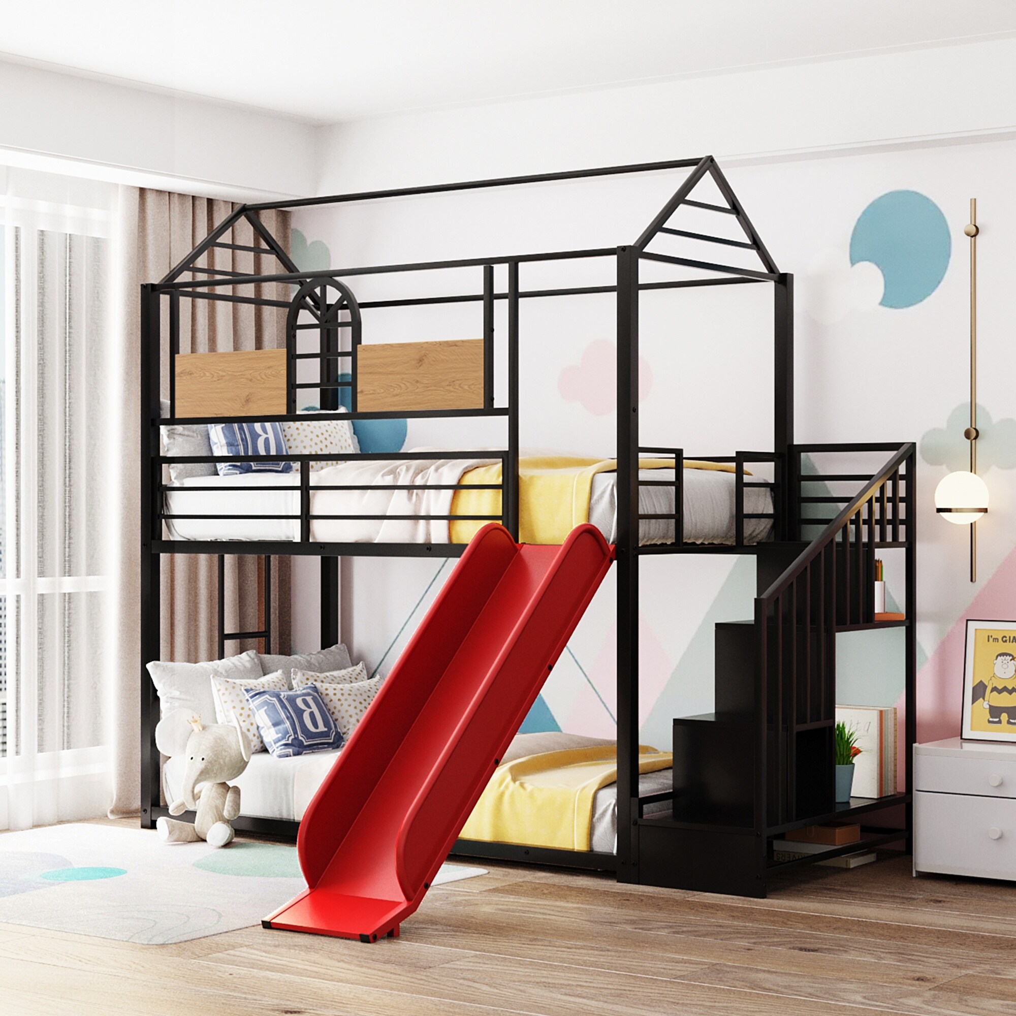 Twin over Twin House Bunk Bed with Slide and Storage Staircase