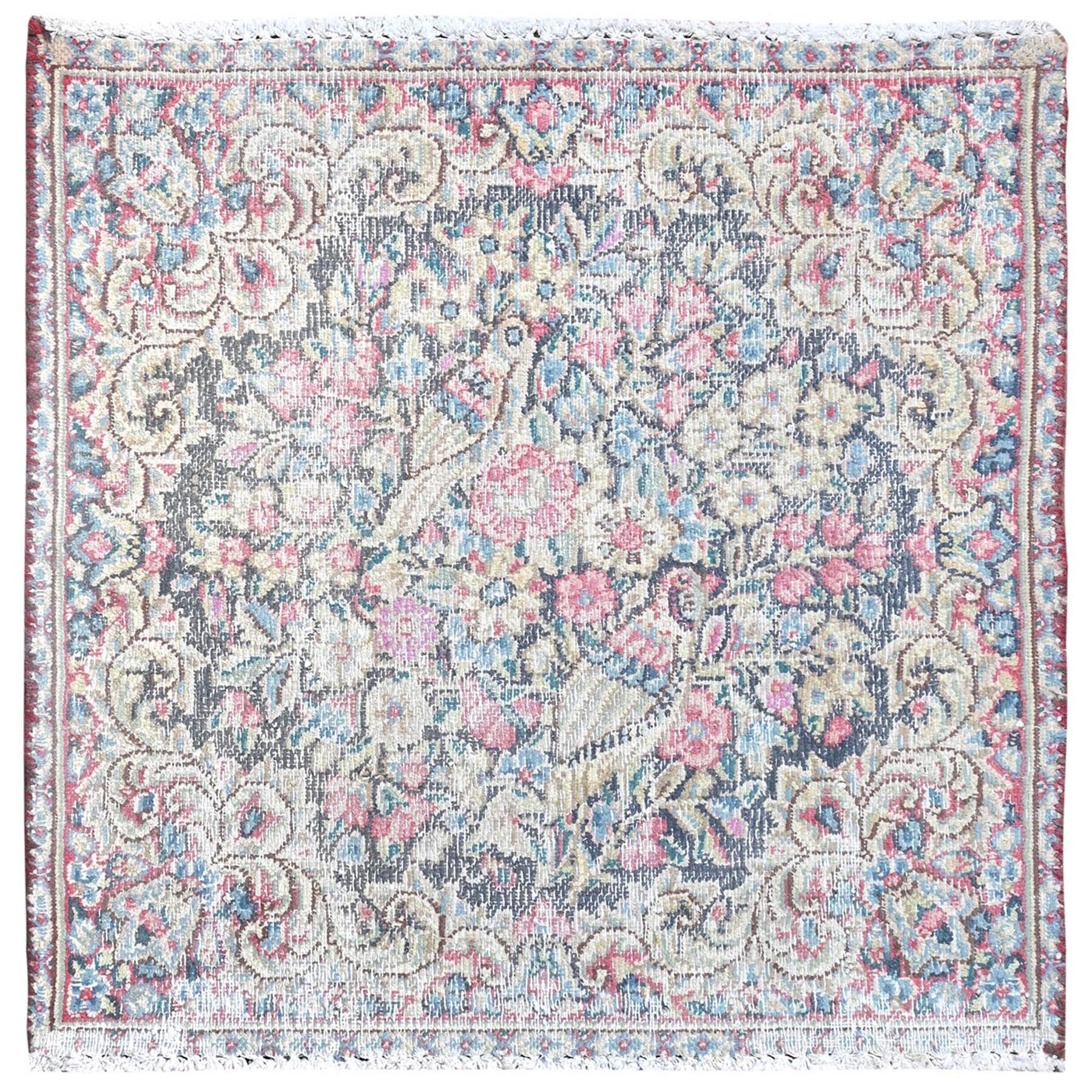 Shahbanu Rugs Colorful, Hand Knotted Old Persian Kerman, Cropped Thin Distressed Look Worn Wool, Square Oriental Rug (1'8"x1'9")