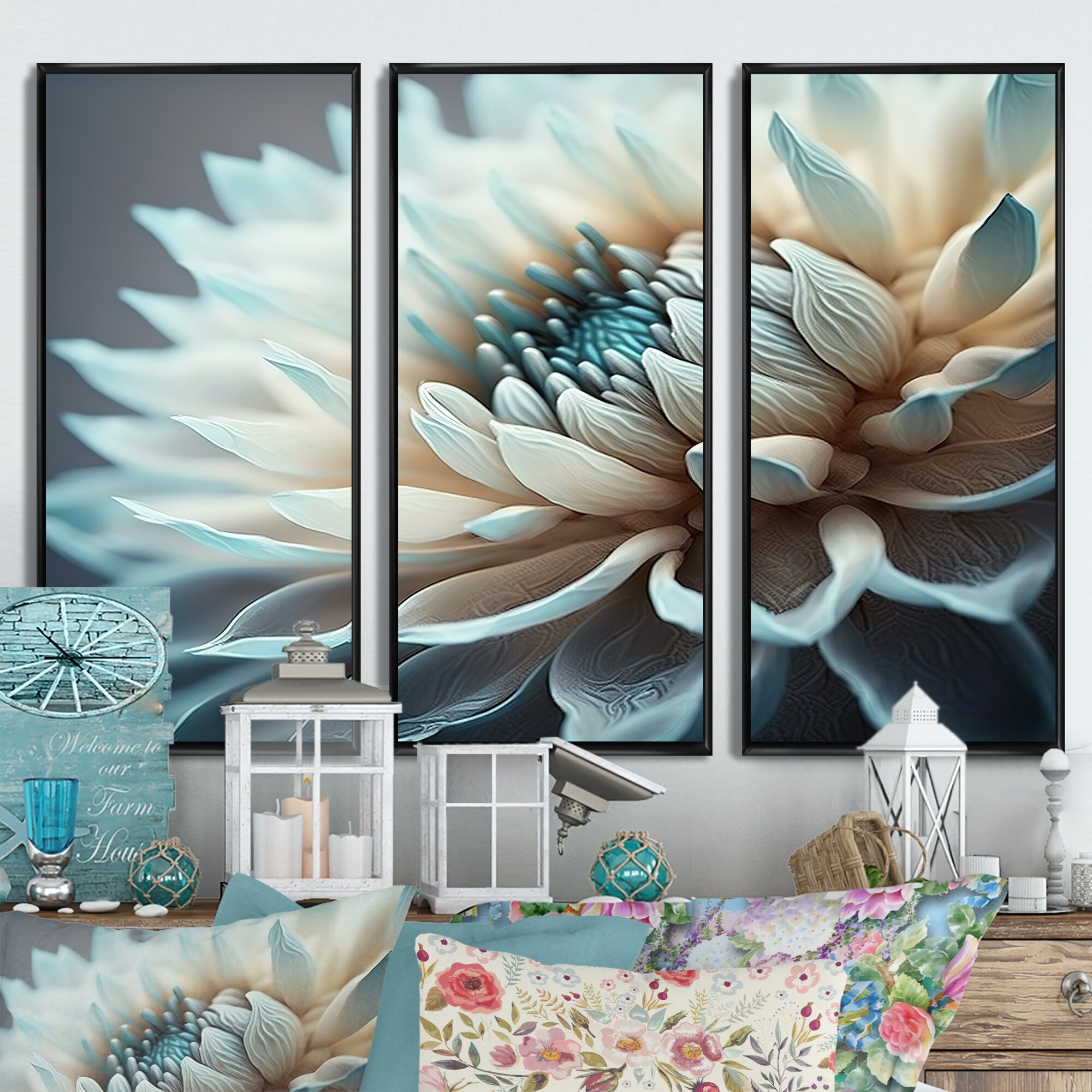 Designart "Blue And White Dahlia Flowers II" Floral Dahlia Framed Canvas Art Print - 3 Panels