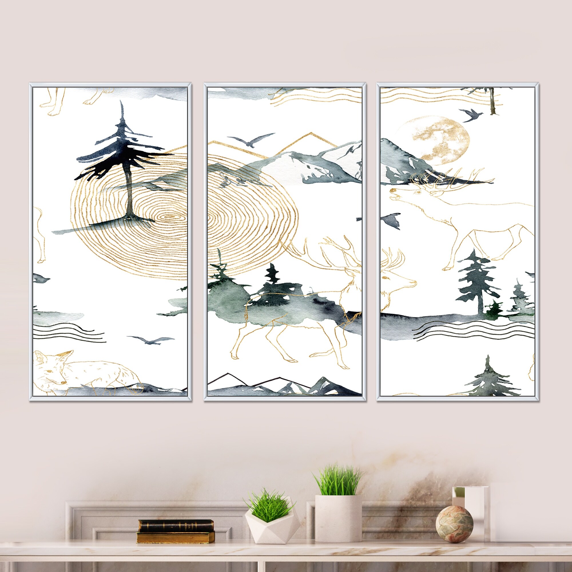 Designart "Minimalistic Gouache With Mountains Trees And Deer" Modern Framed Wall Decor Set of 3 - 4 Colors of Frames
