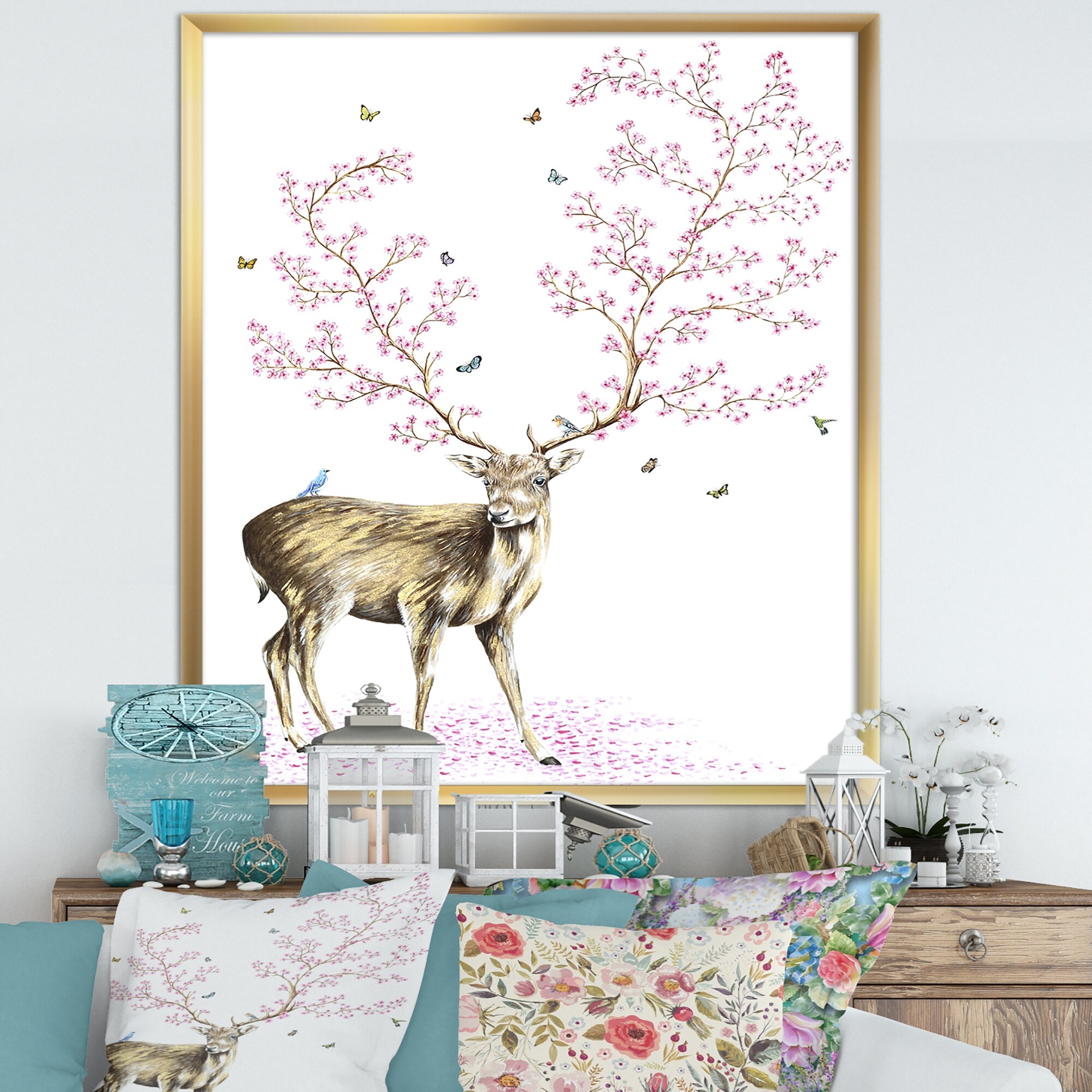Designart "Cherry Blossom Deer" Cottage Framed Art Print