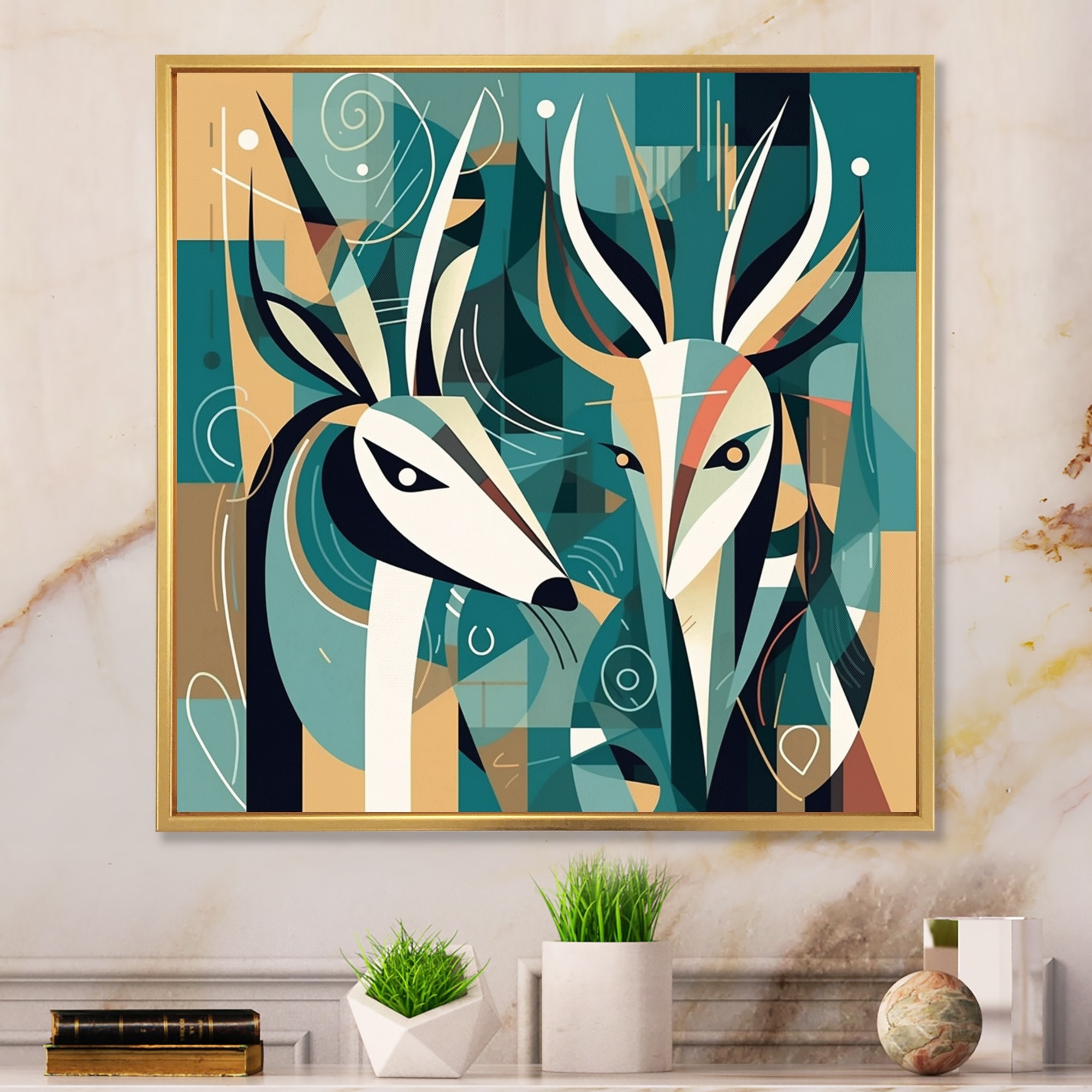 Designart "Green Beige Abstract Deer Portrait" Animals Deer Framed Canvas Wall Art