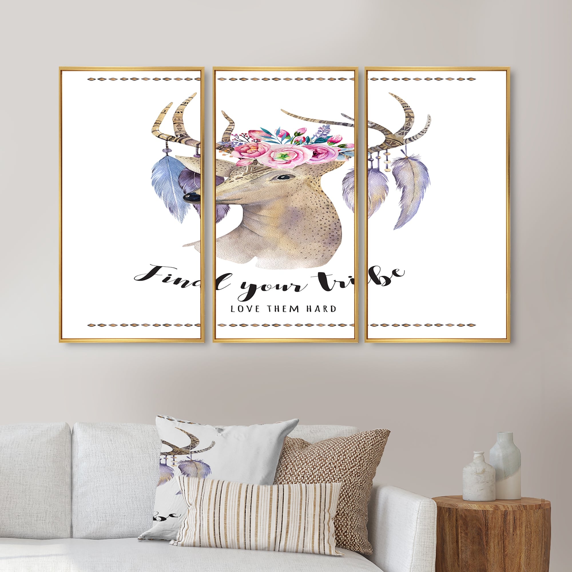 Designart "Find Your Tribe Ethnic Deer" Traditional Framed Wall Art Set of 3 - 4 Colors of Frames