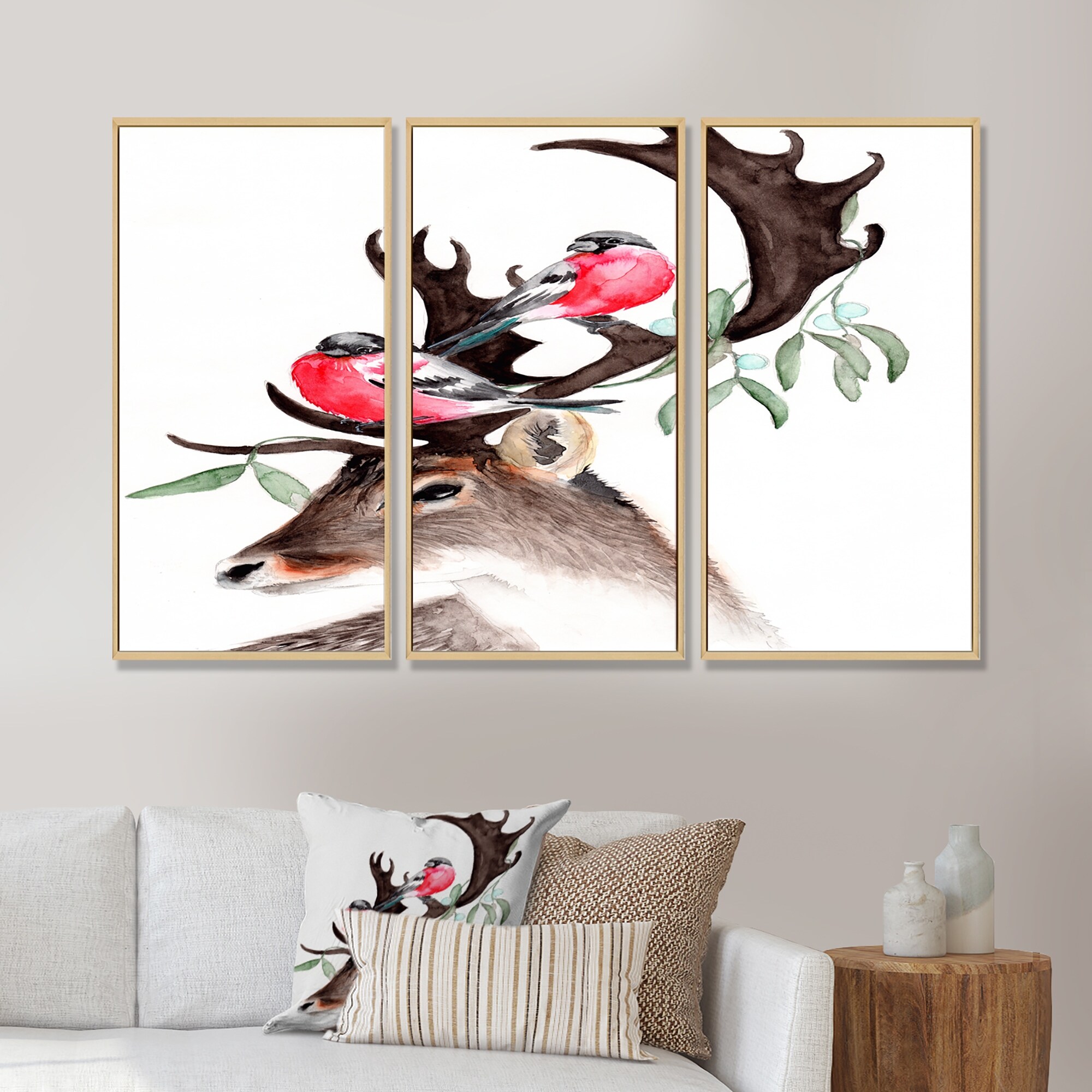 Designart "Deer With Two Red Bullfinches" Traditional Framed Canvas Wall Art Set of 3 - 4 Colors of Frames