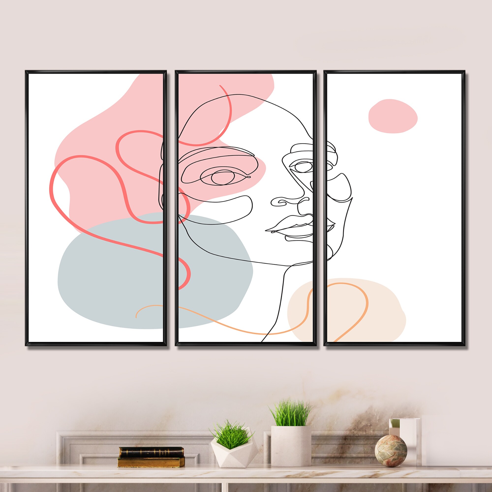 Designart "One Line Drawing of Young Woman in Pastel Tones" Modern Framed Canvas Wall Art Print Set of 3 - 4 Colors of Frames