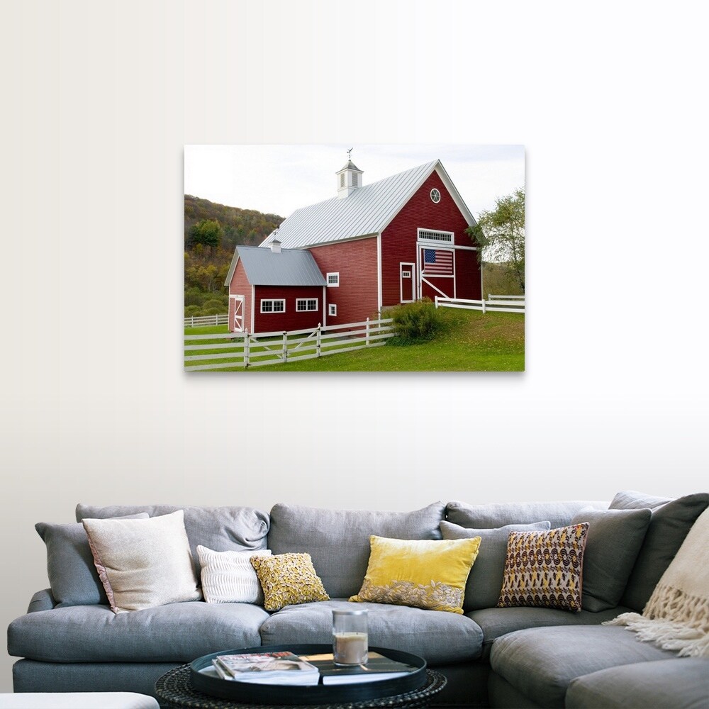 "Classic New England farm with red barn and white fence, American flag on barn" Canvas Wall Art
