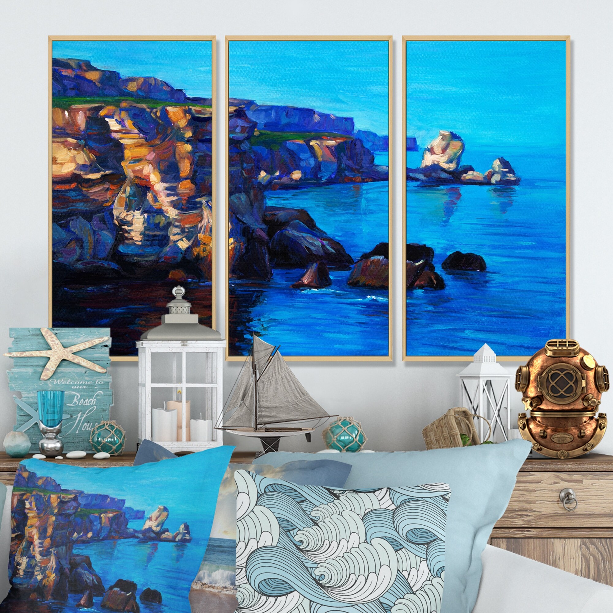Designart "Cliffs By the Ocean in the Evening Glow" Nautical & Coastal Framed Canvas Wall Art Set of 3 - 4 Colors of Frames