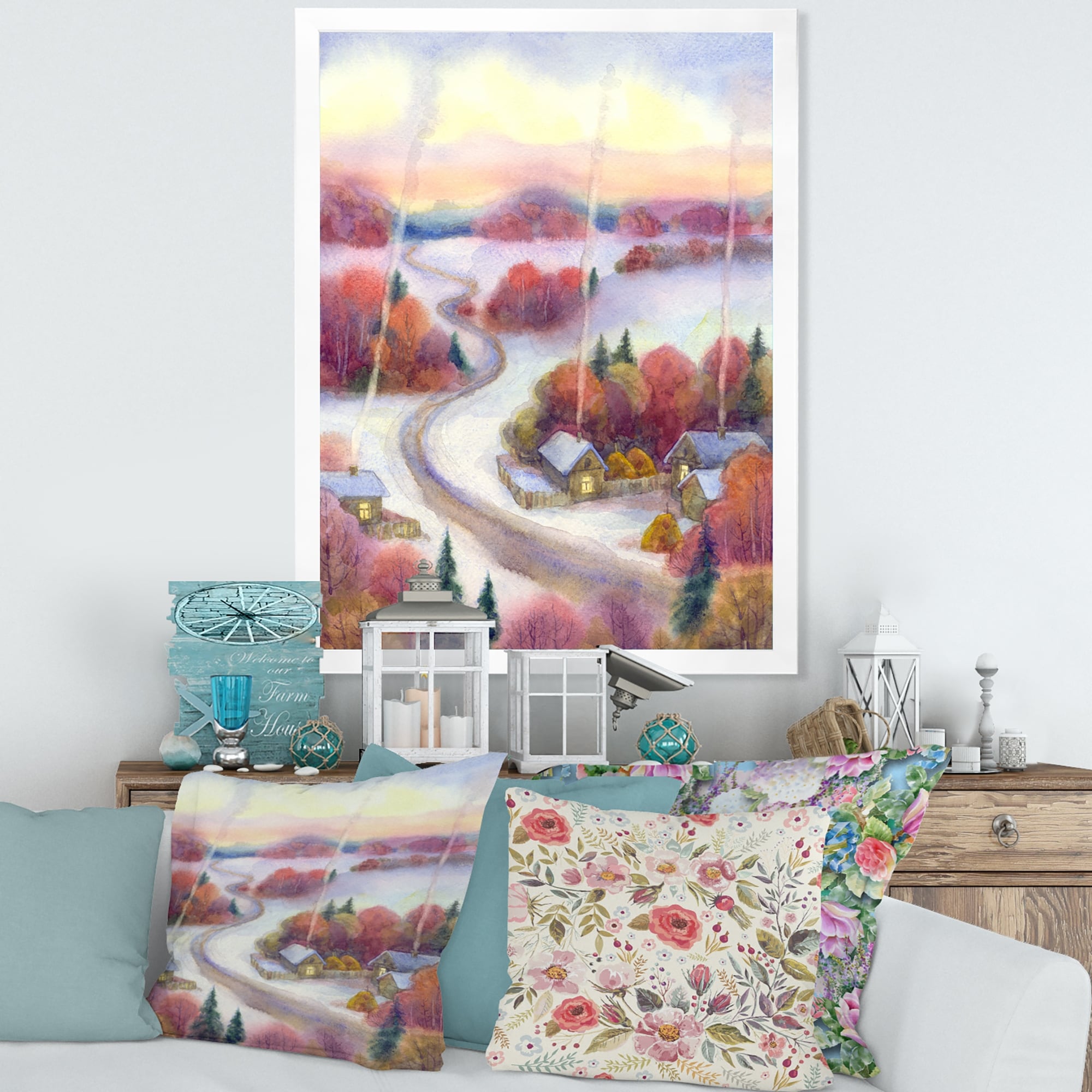 Designart "Winter Evening in the Village" Country Framed Art Print