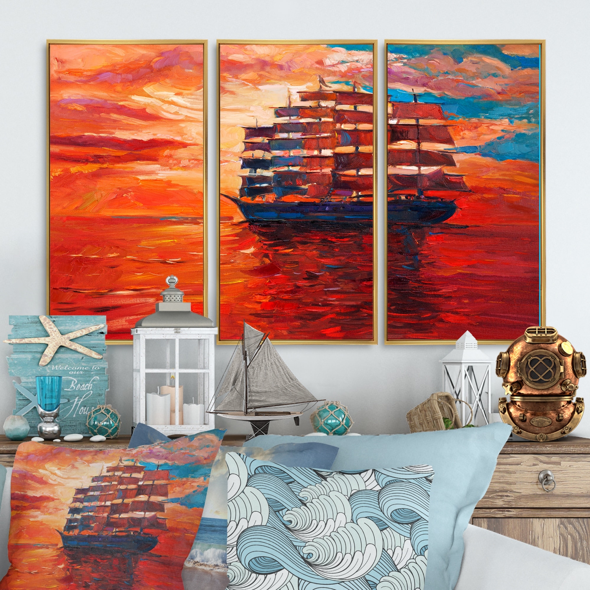 Designart "Frigat During Evening Glow on the Ocean Horizon" Nautical & Coastal Framed Canvas Wall Art Print - 3 Panels