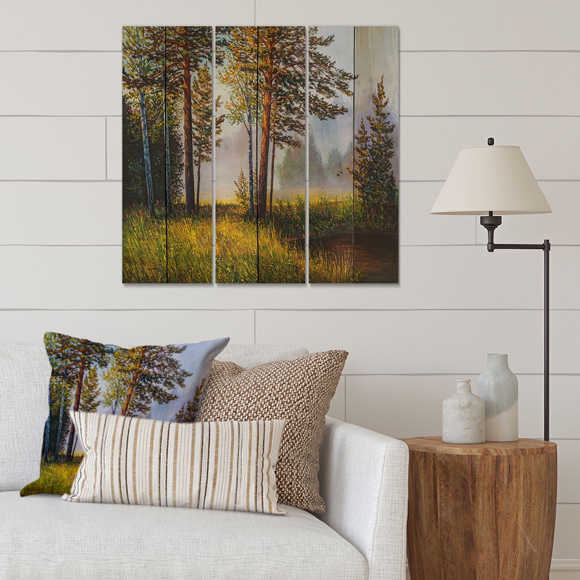 Designart 'Subtle Evening Light Through the Trees III' Lake House Print on Natural Pine Wood - 3 Panels