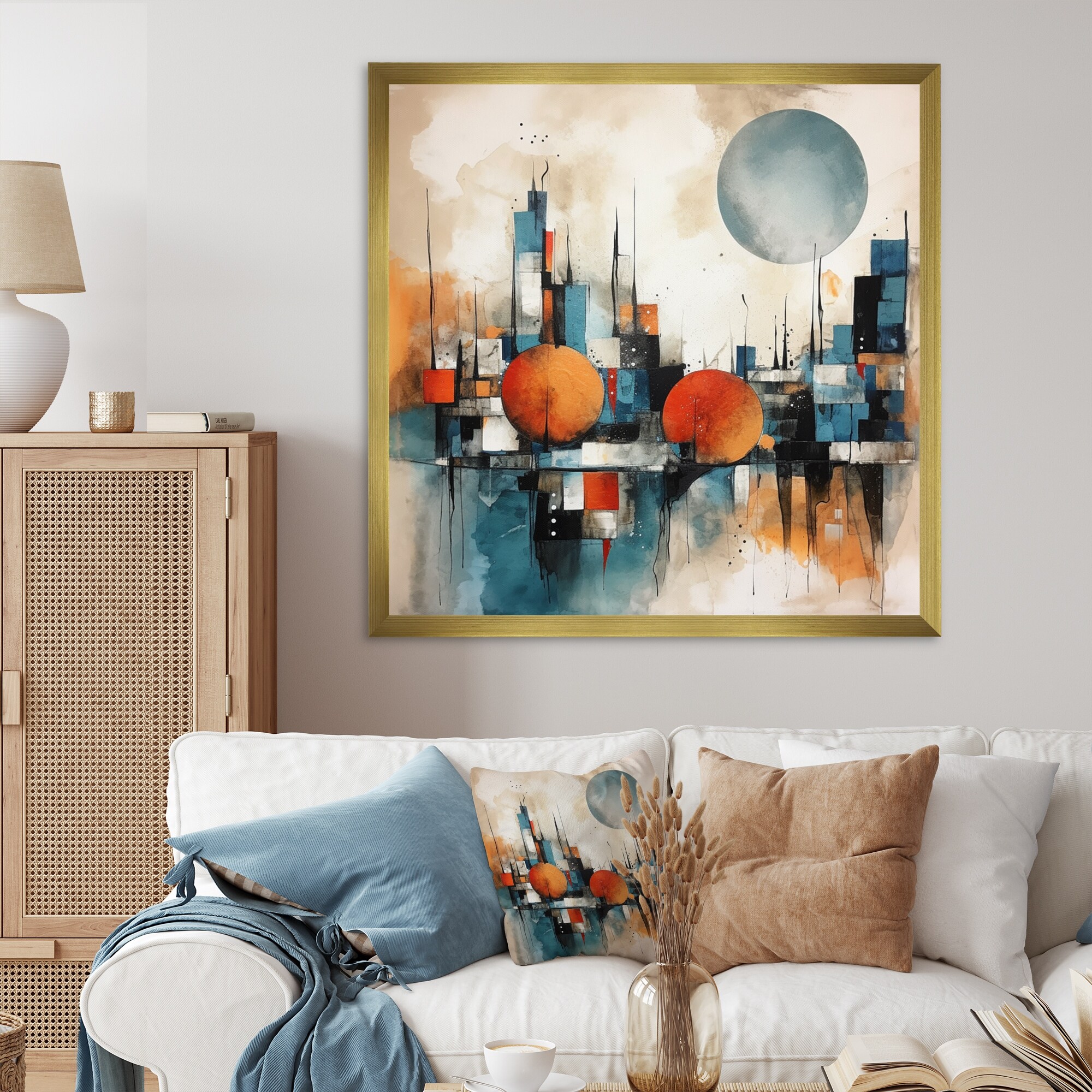 Designart "Orange And Blue Artistic Expressions Iv" Modern Geometric Framed Canvas Wall Art