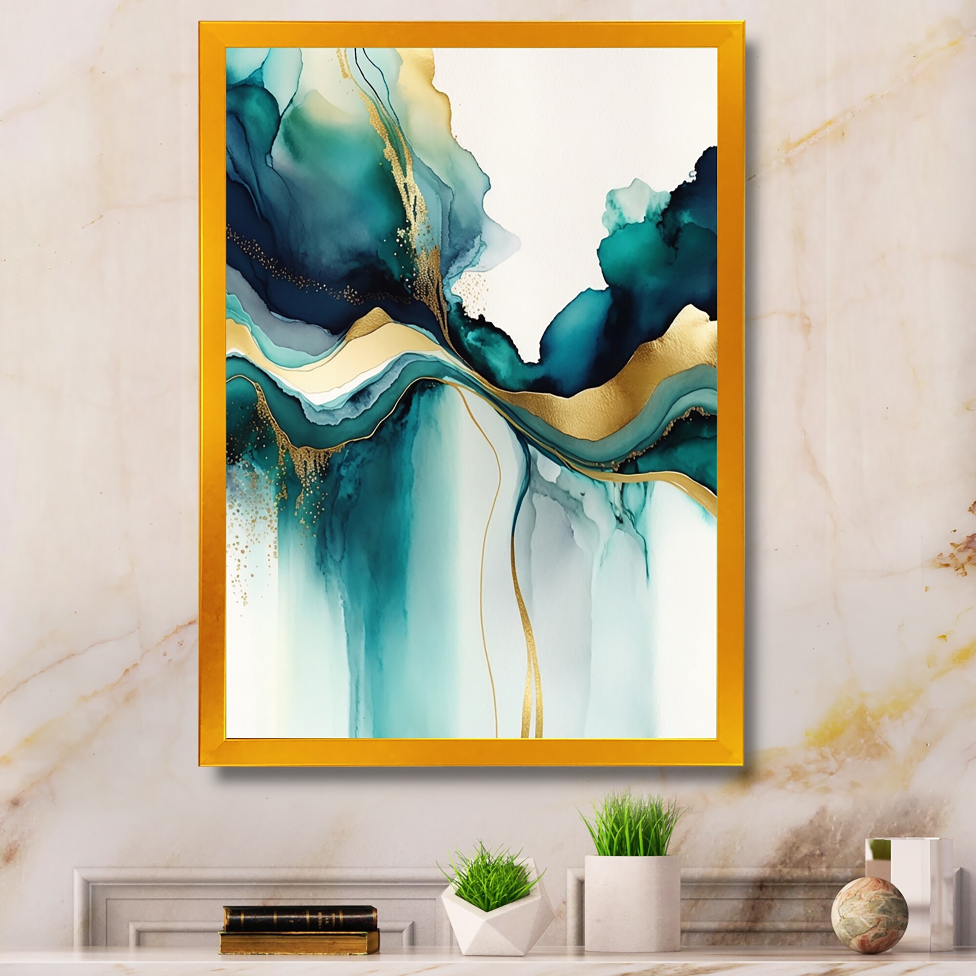 Designart "Gold And Green Marble Expression" Abstract Marble Framed Wall Decor