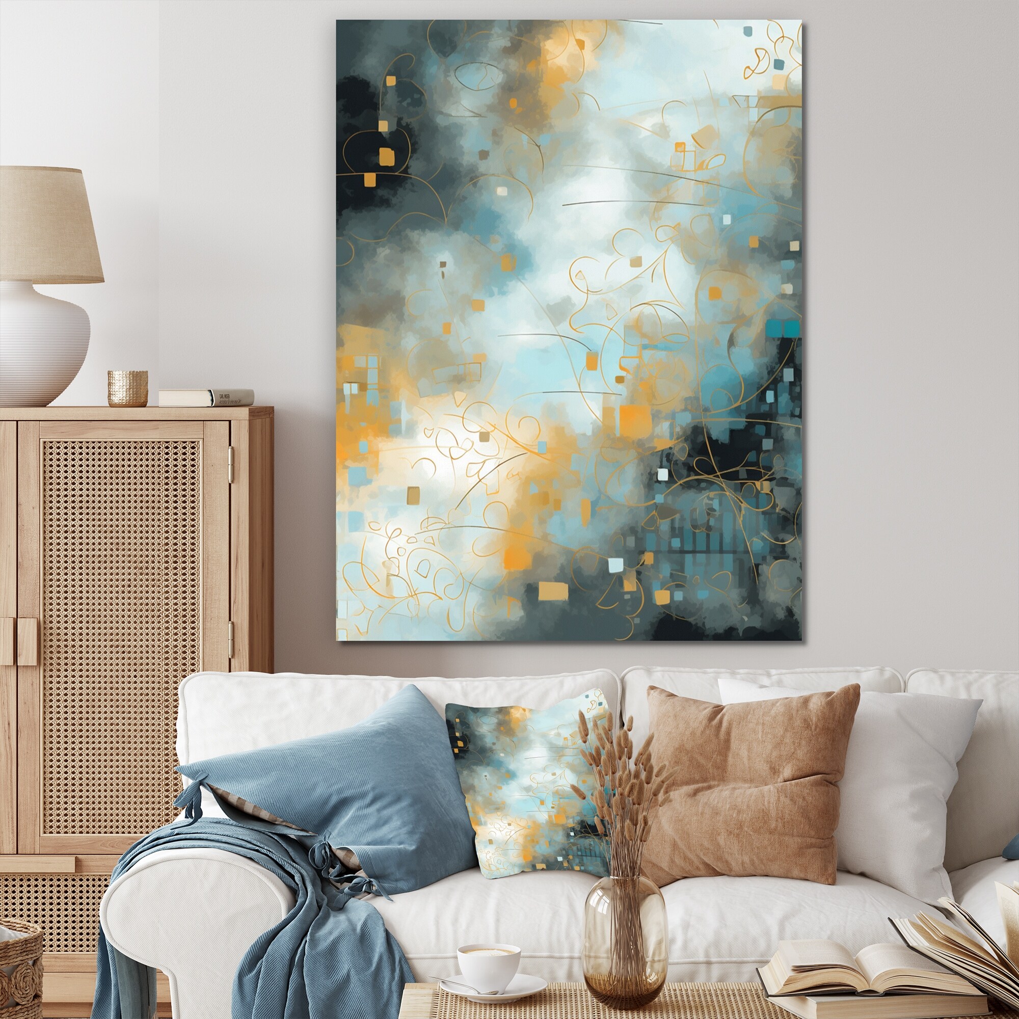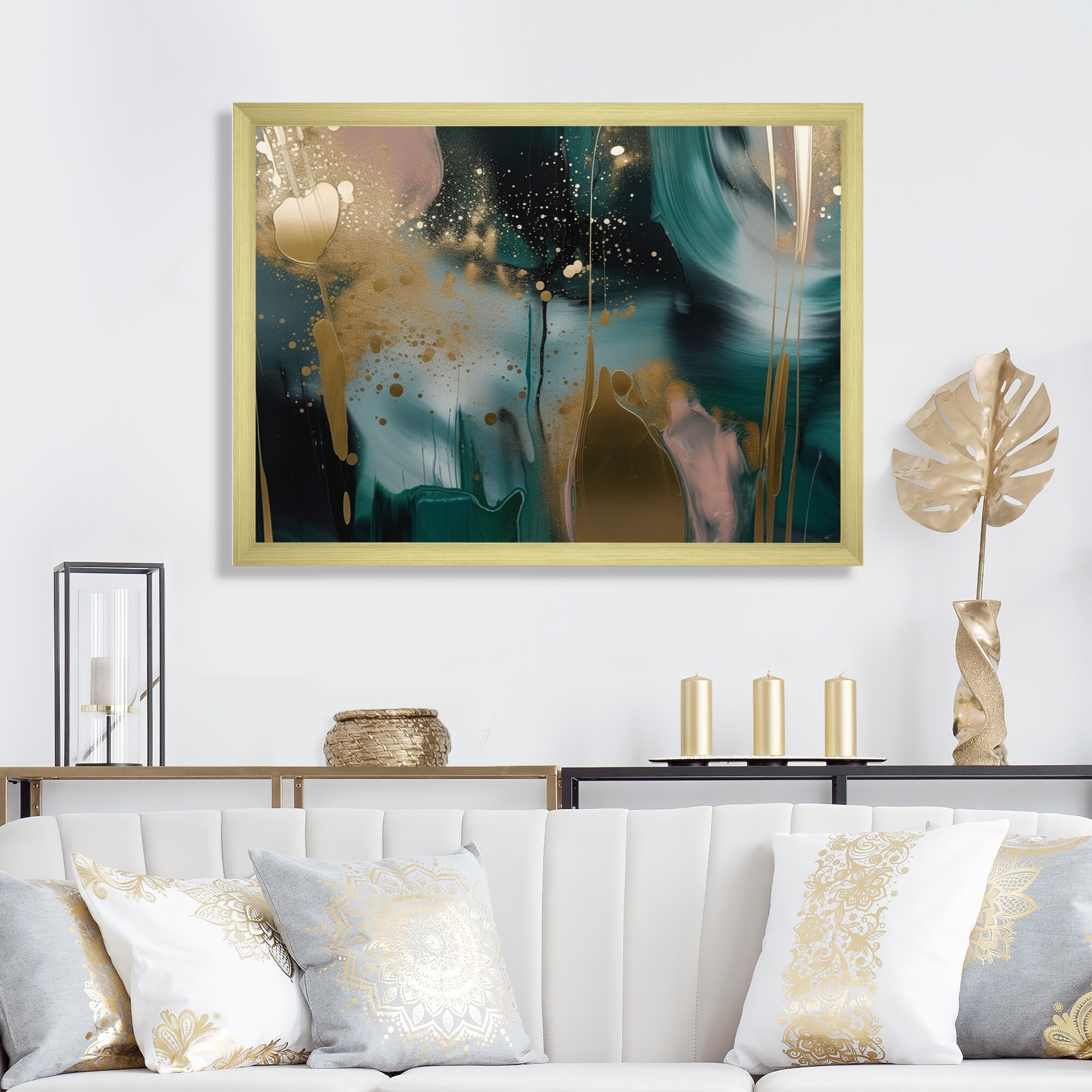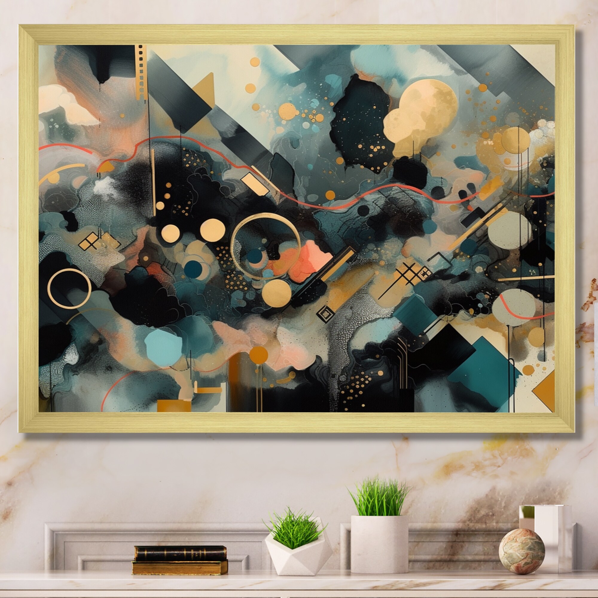 Designart "Teal And Gold Abstract Expression I" Modern Framed Art Print
