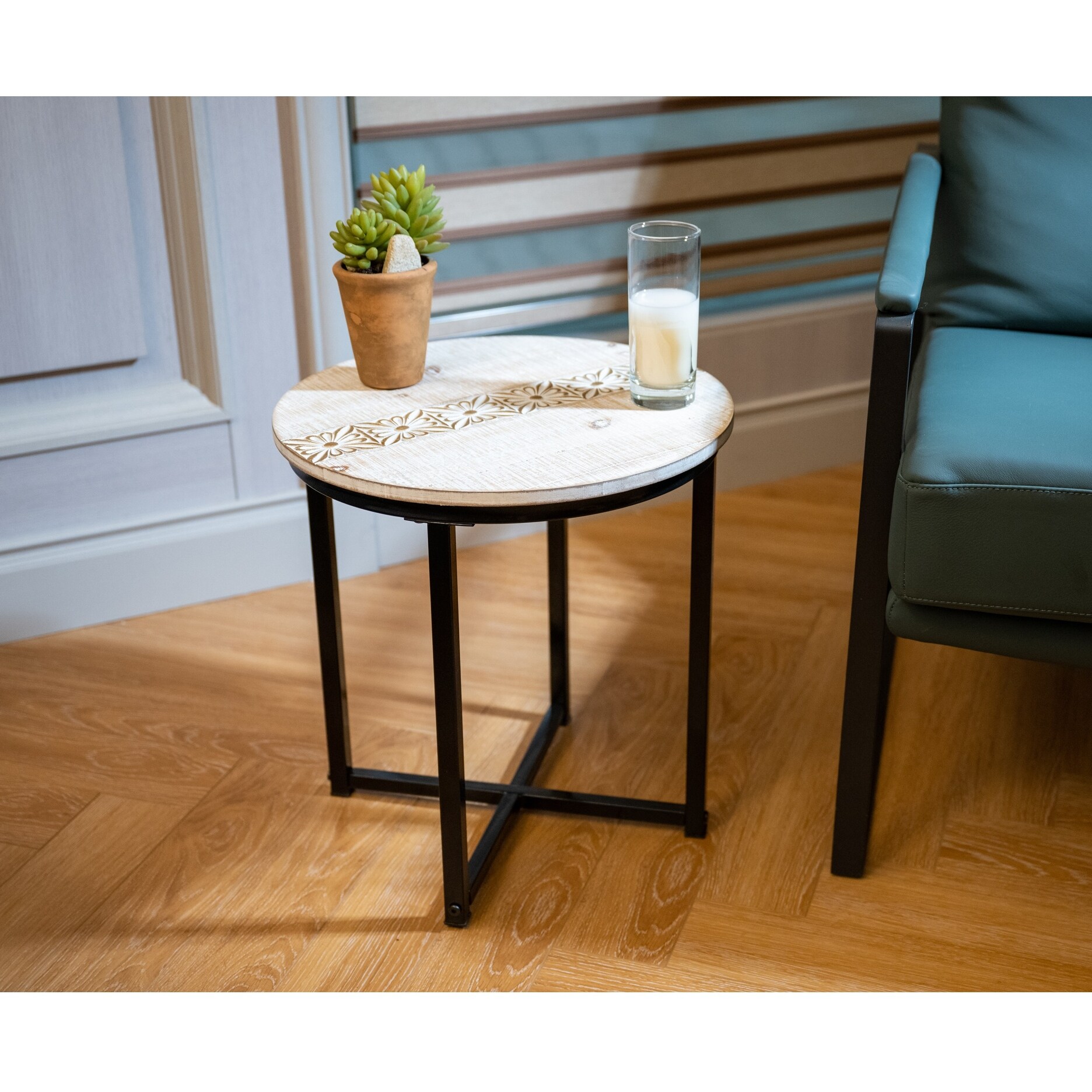 Farmhouse Cottagecore End Table, French Country Hand Carved Top End Table for Living Room, Crossed Metal Frame, White Natural