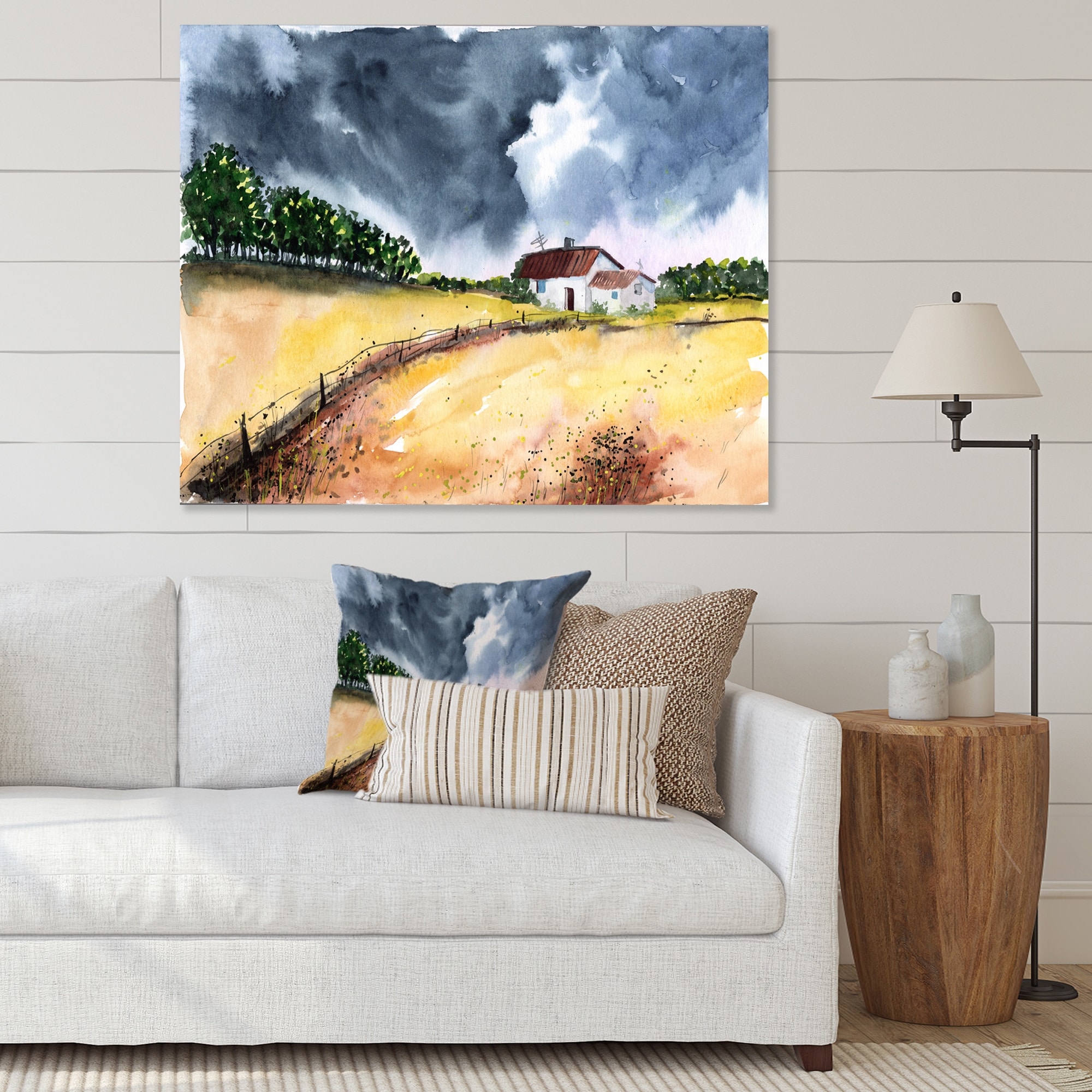 Designart "Yellow Field With Trees A Small Fence, Farmhouses" Country Canvas Wall Art Print