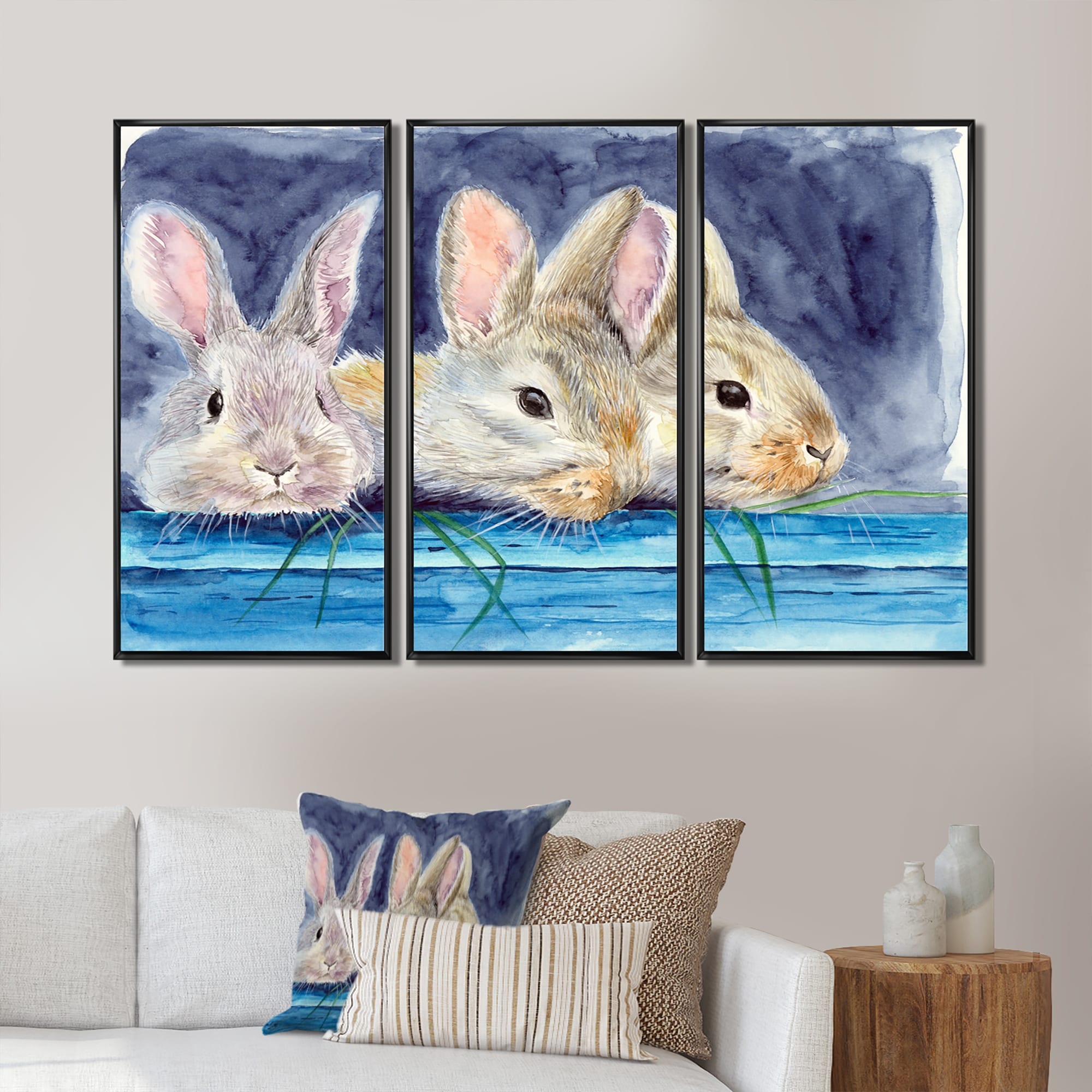 Designart "Three Fluffy Rabbits Behind A Blue Wooden Fence I" Traditional Framed Wall Art Set of 3 - 4 Colors of Frames