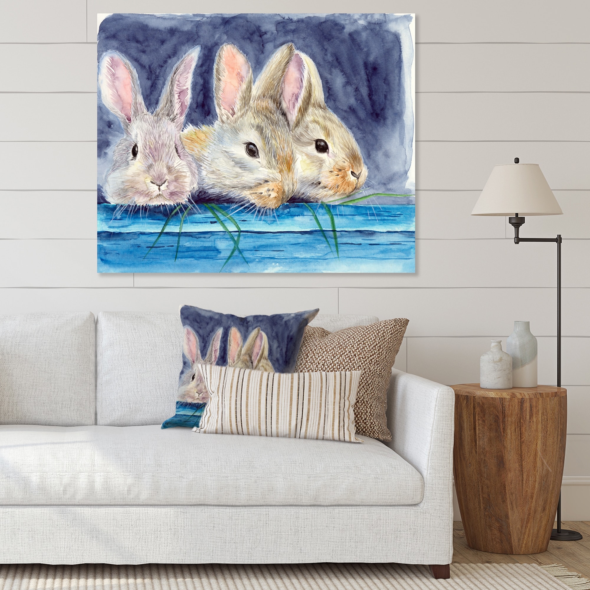 Designart "Three Fluffy Rabbits Behind A Blue Wooden Fence I" Traditional Canvas Wall Art Print