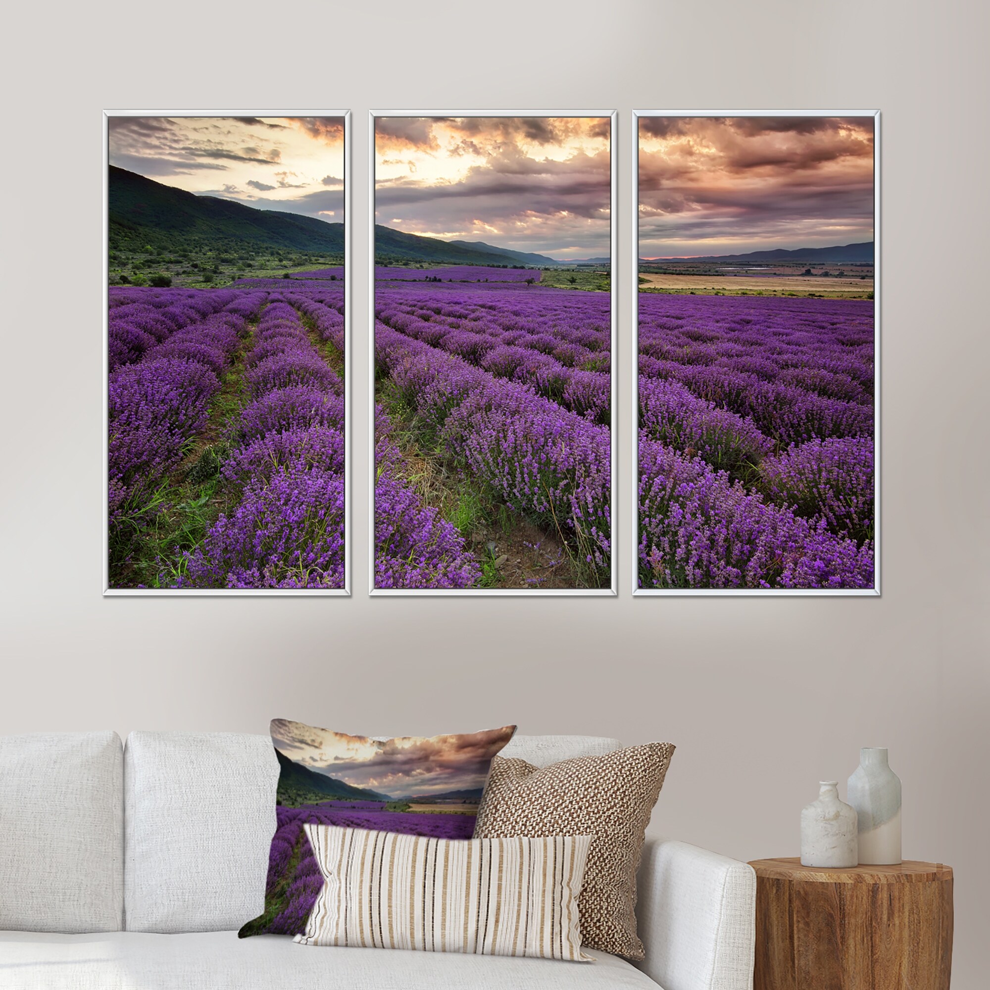 Designart "Lavender Field At Dawn I" Farmhouse Framed Canvas Wall Art Set of 3 - 4 Colors of Frames