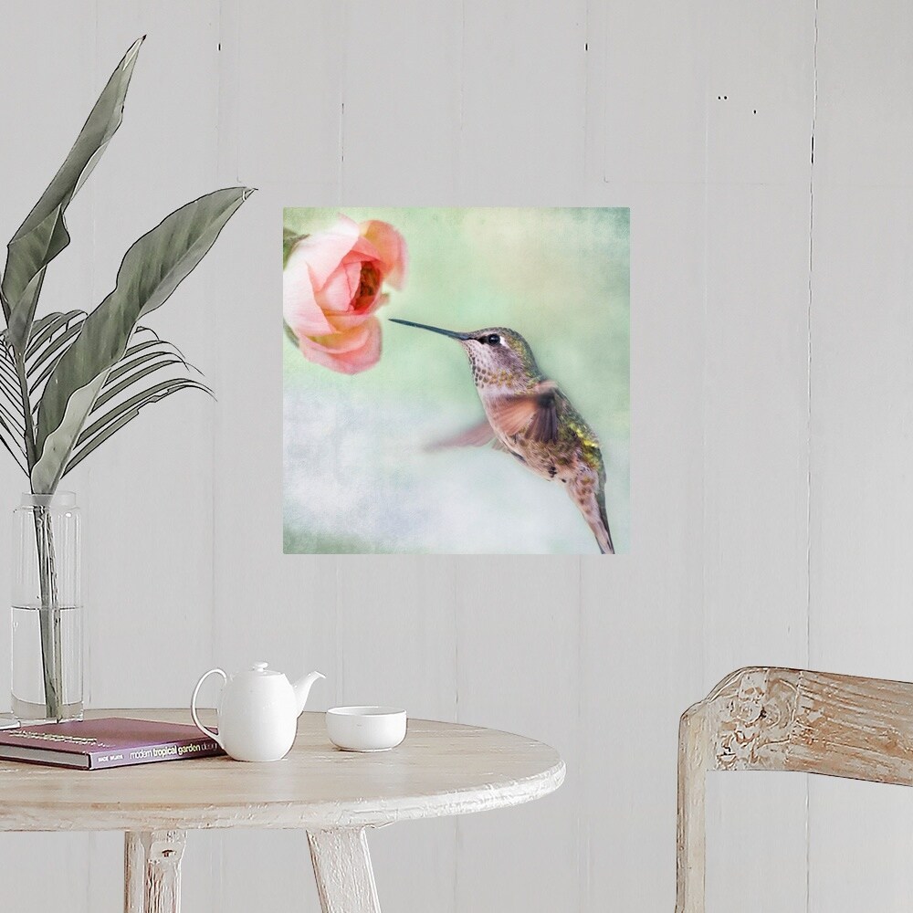 "Close up of hummingbird in-flight and pink ranunculus flower." Poster Print - Multi