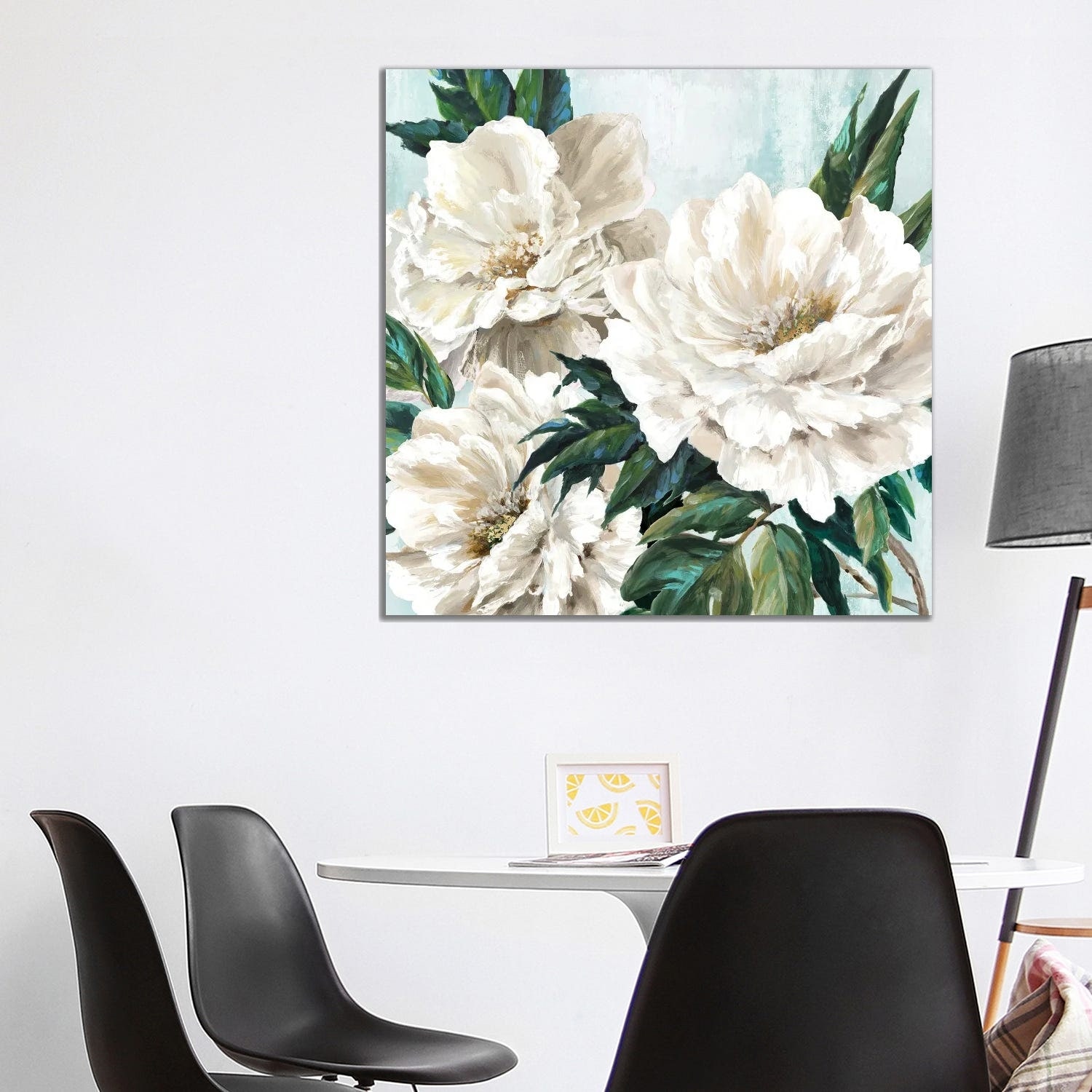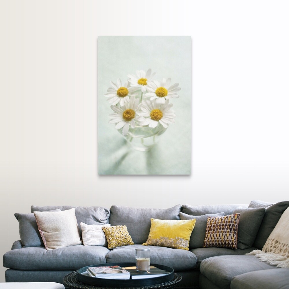 "Looking down at vase of fresh white daisies." Canvas Wall Art