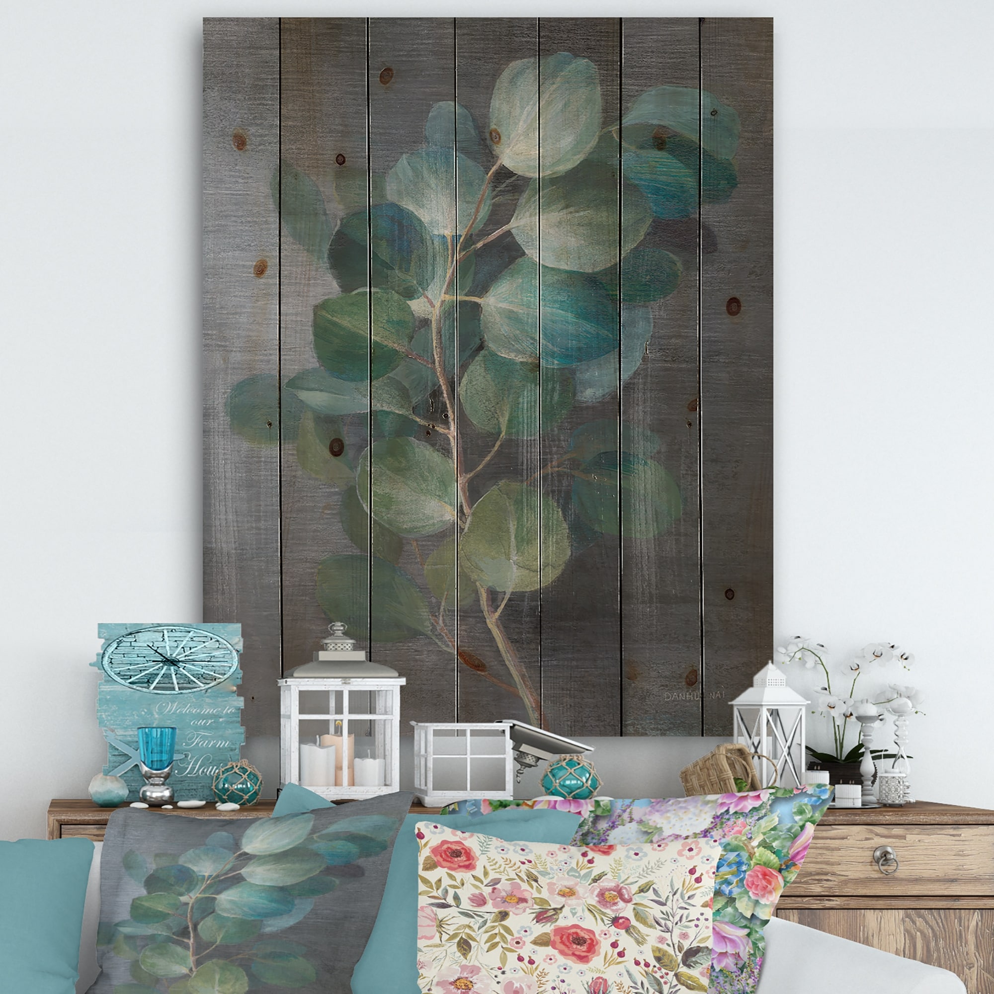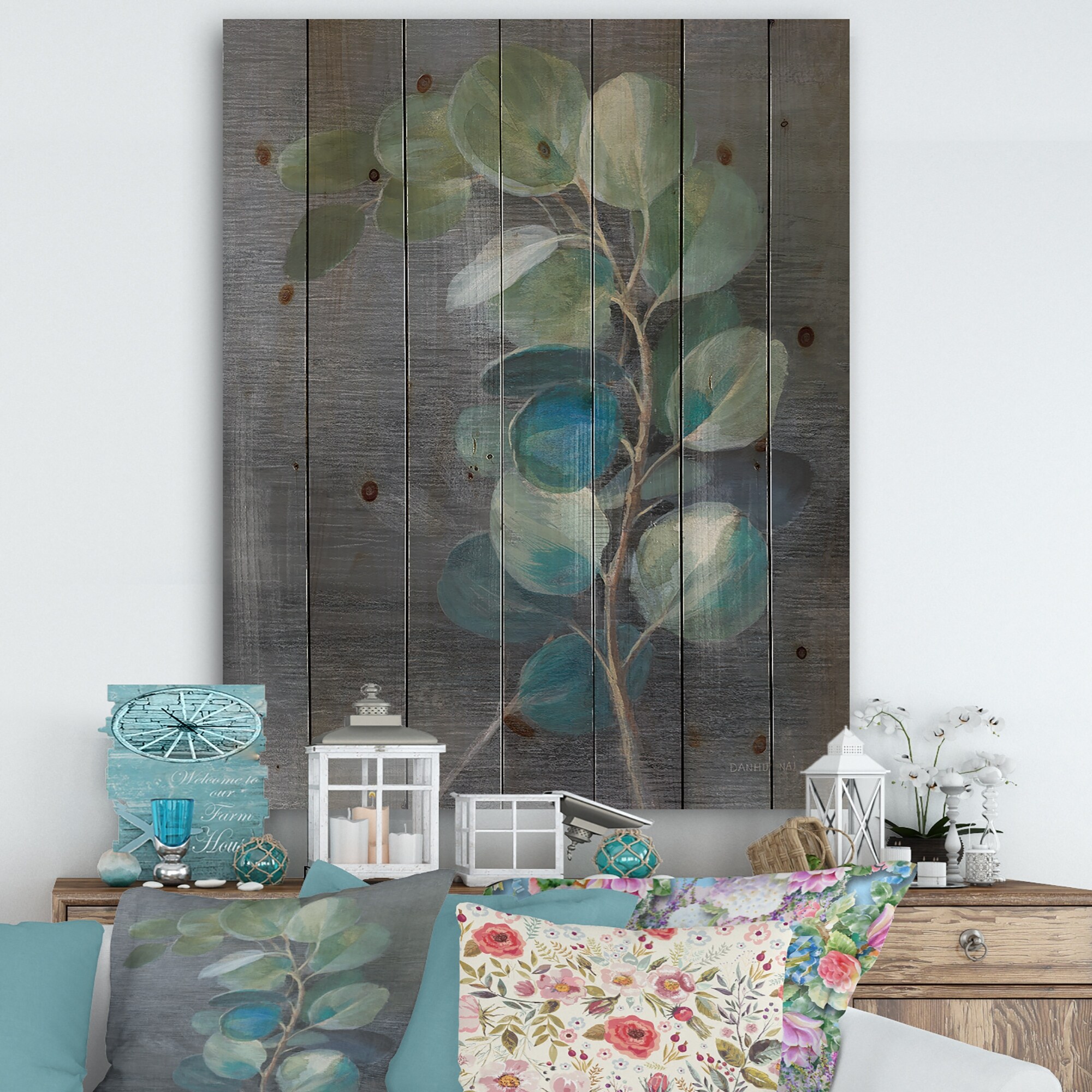 Designart 'Fresh leaves I' Traditional Print on Natural Pine Wood - Blue