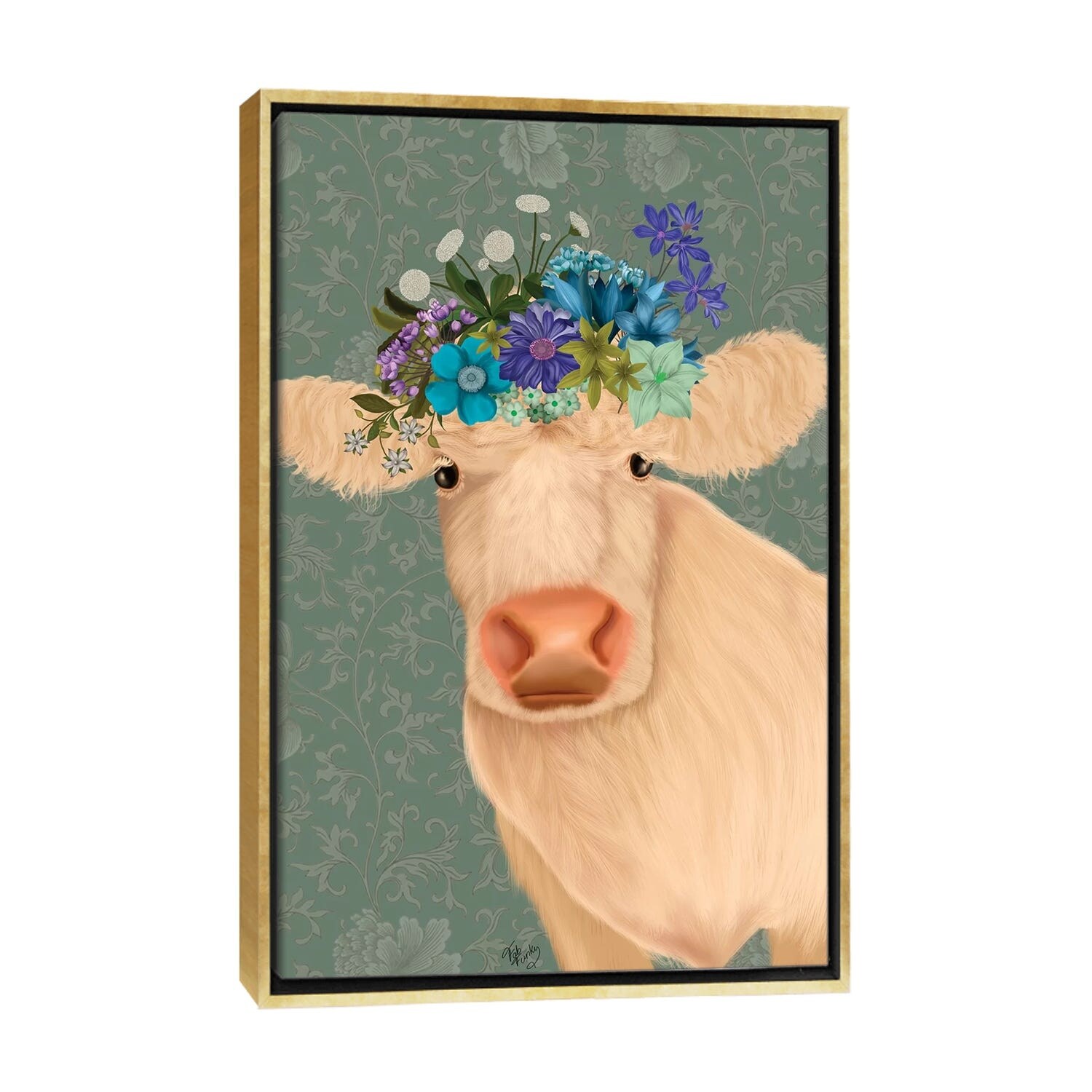 iCanvas "Cow Cream, Bluebells" by Fab Funky Framed