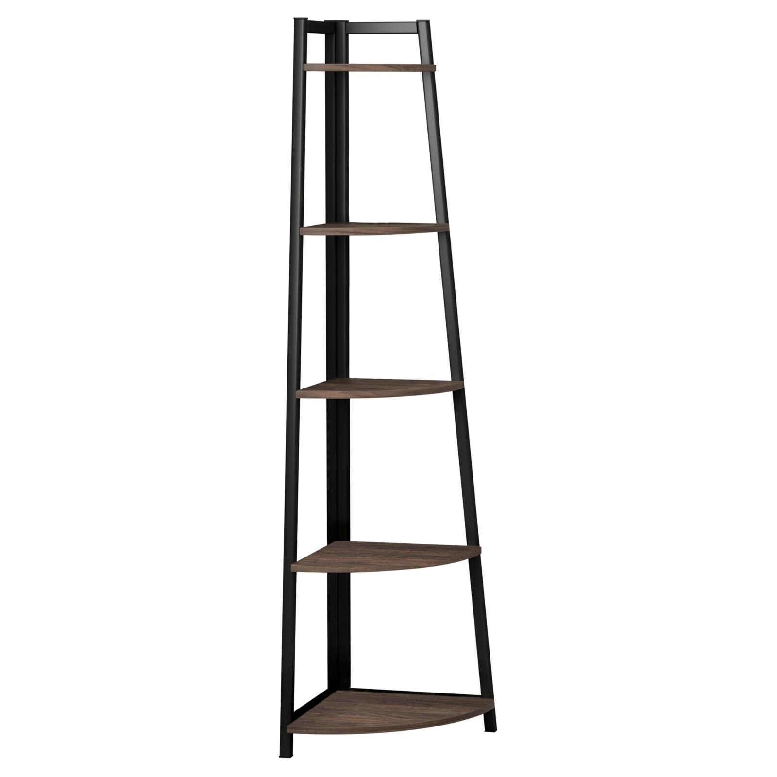 Industrial Corner Shelf, 5-Tier Bookshelf, Plant Stand, Wood Look Accent Furniture with Metal Frame, Rustic Brown