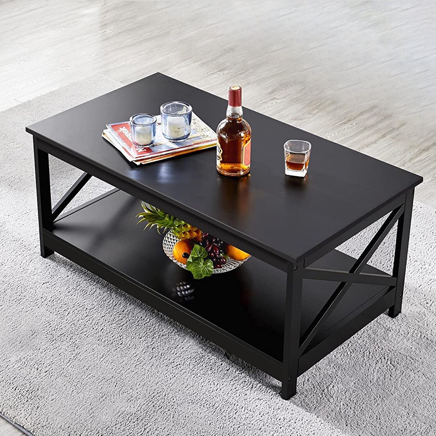 Coffee Table Living Room Furniture Table with Storage Shelf, Black