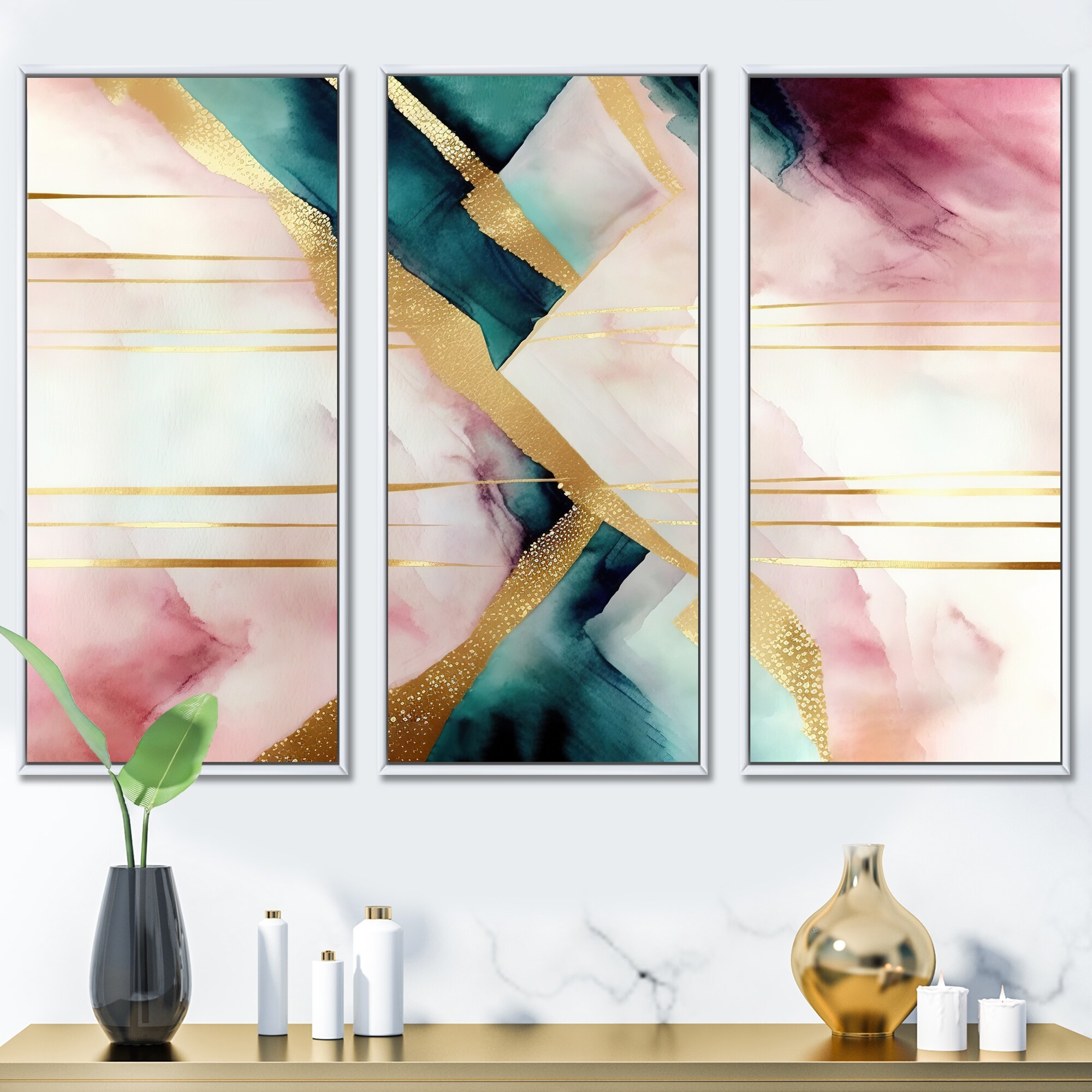 Designart "Abstract Geode Geometric Pink And Green II" Modern Geometric Framed Canvas Art Print - 3 Panels