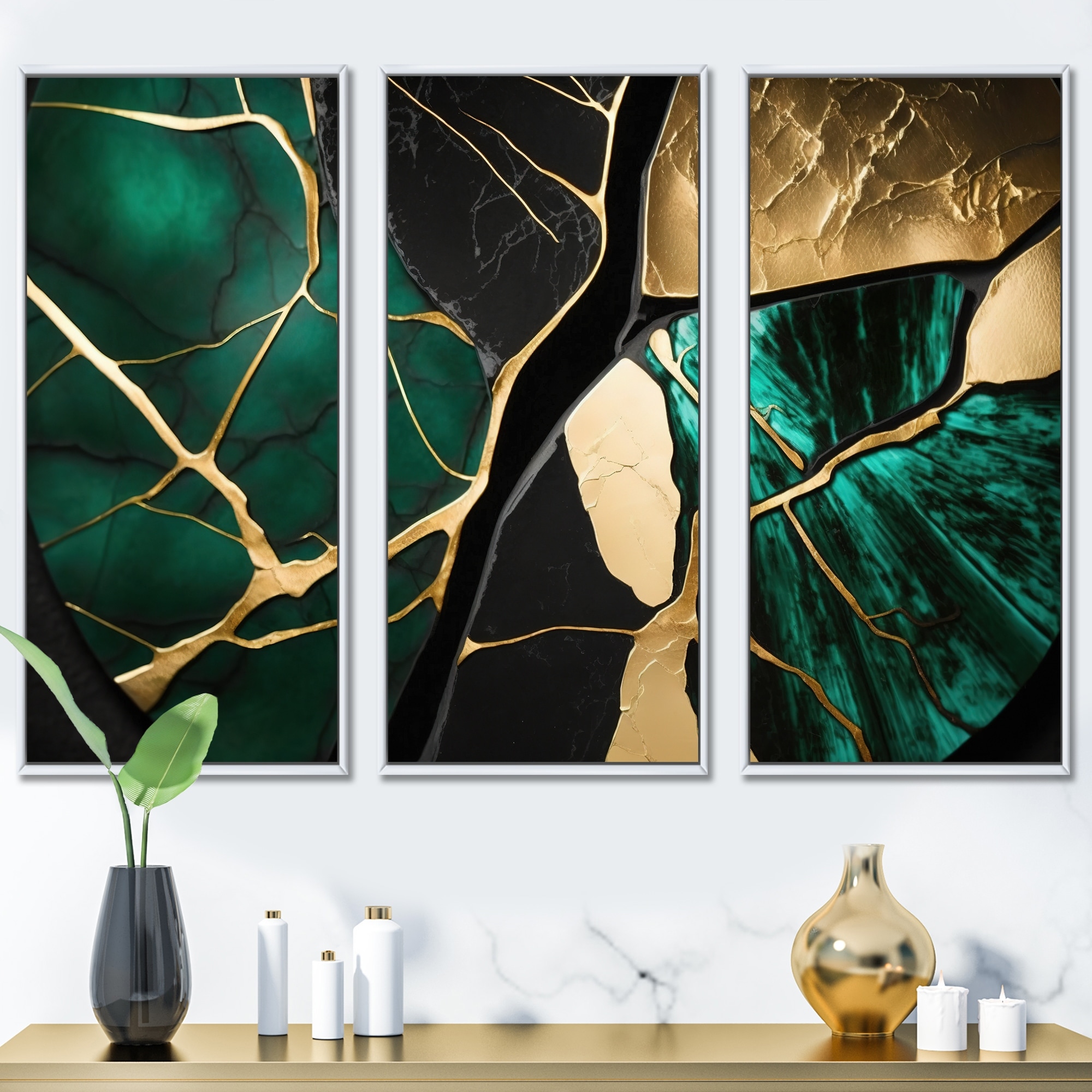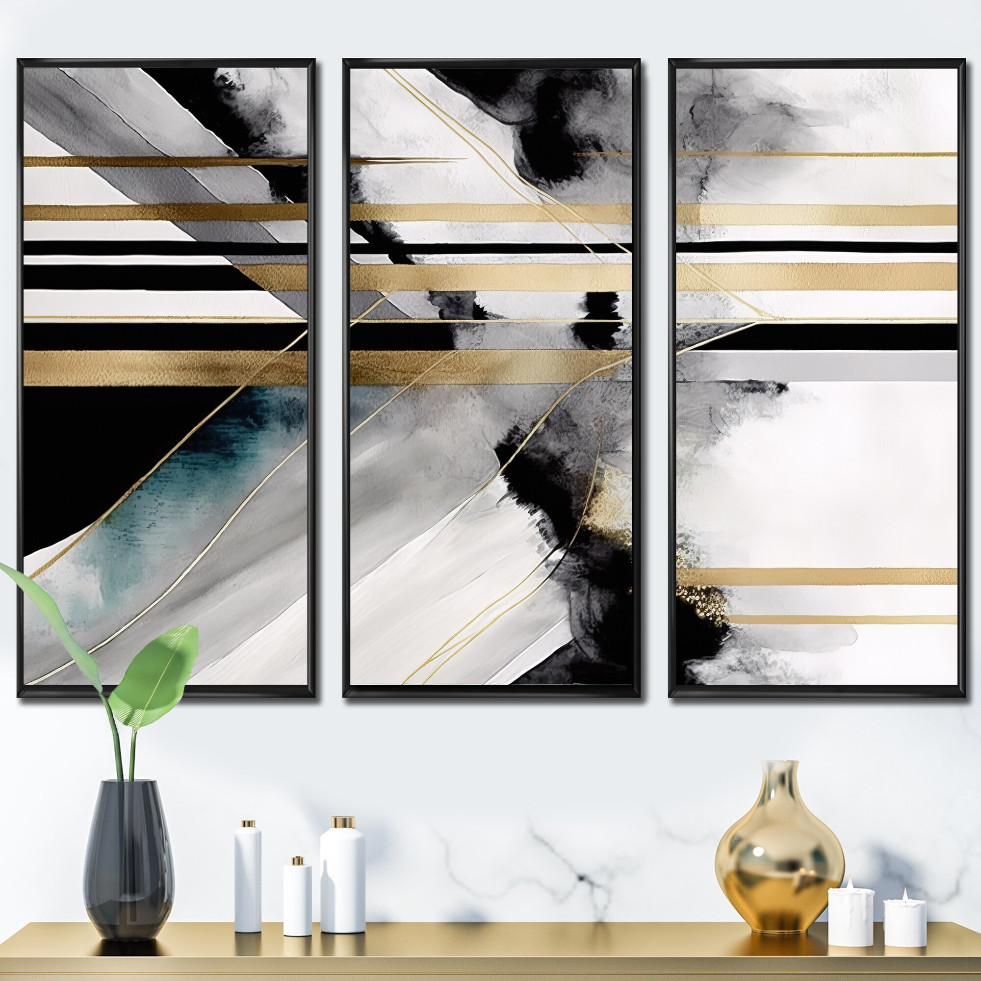 Designart "Abstract Geode Geometric Black And Gold I" Modern Geometric Framed Canvas Art Print - 3 Panels