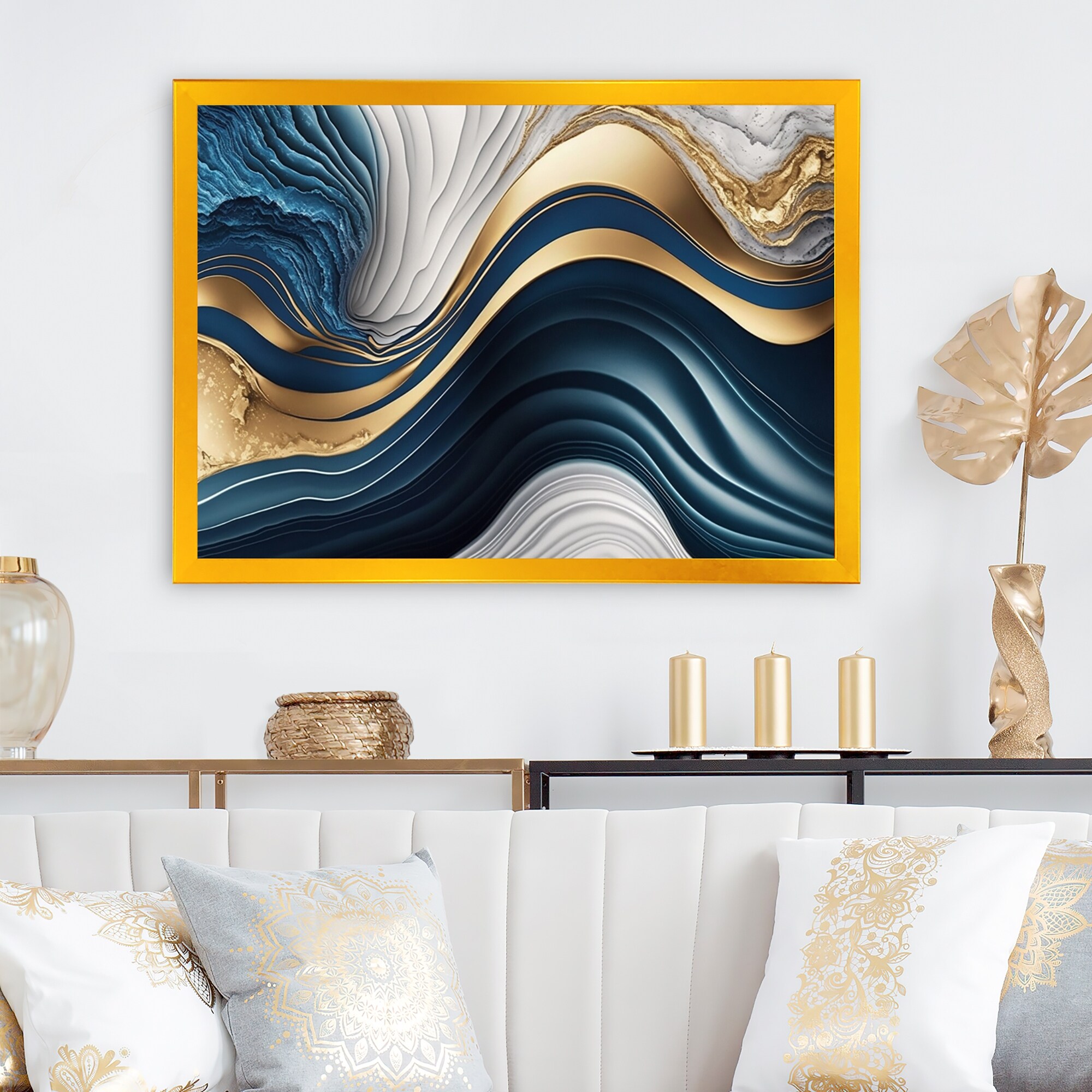 Designart "Abstract Geode Waves Blue And Gold II" Modern Waves Framed Canvas Art Print - 3 Panels