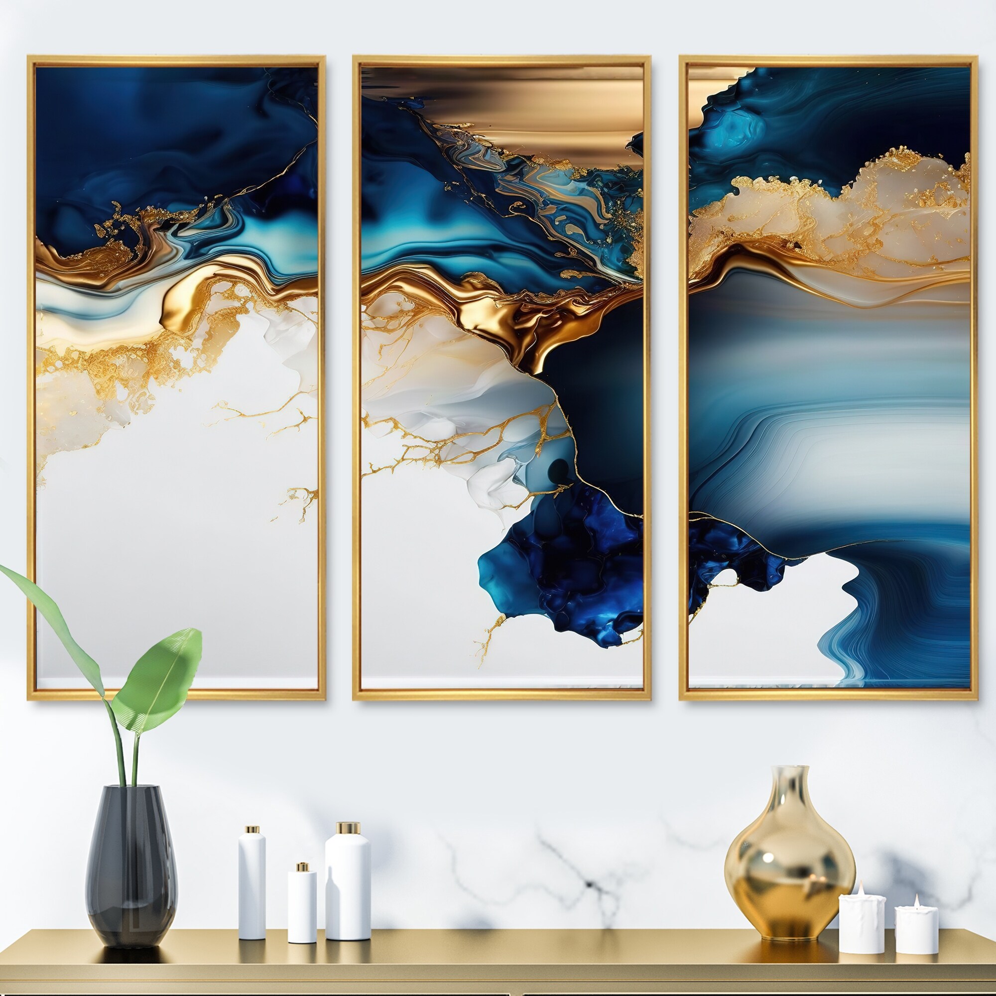 Designart "Abstract Geode Gold And Blue Marble I" Abstract Marble Framed Canvas Art Print - 3 Panels