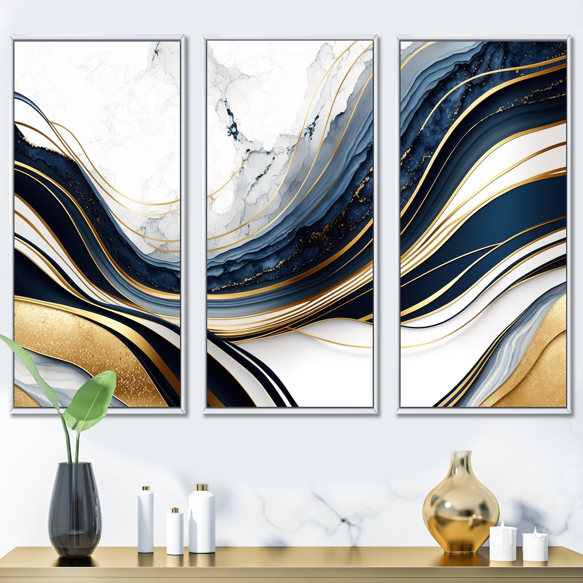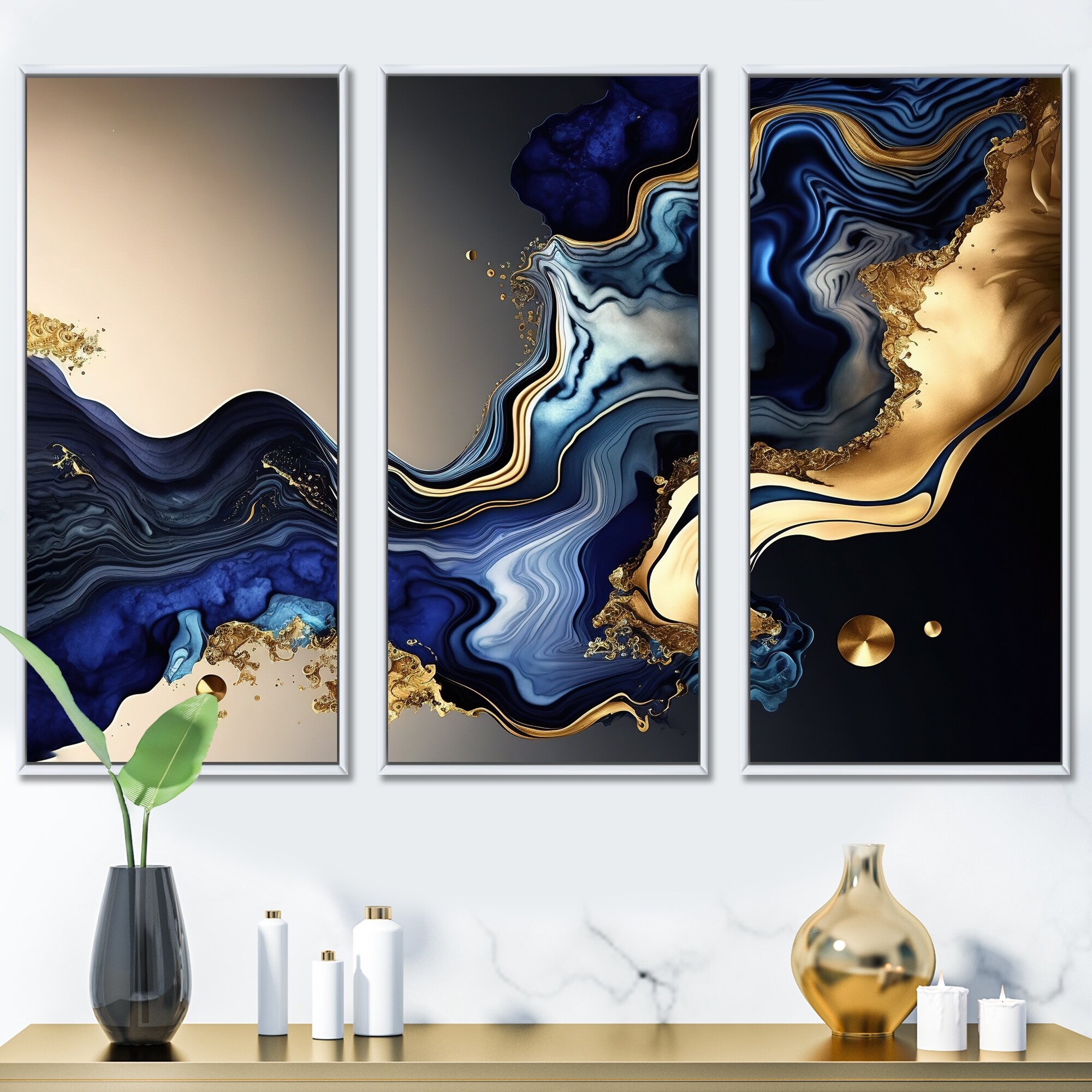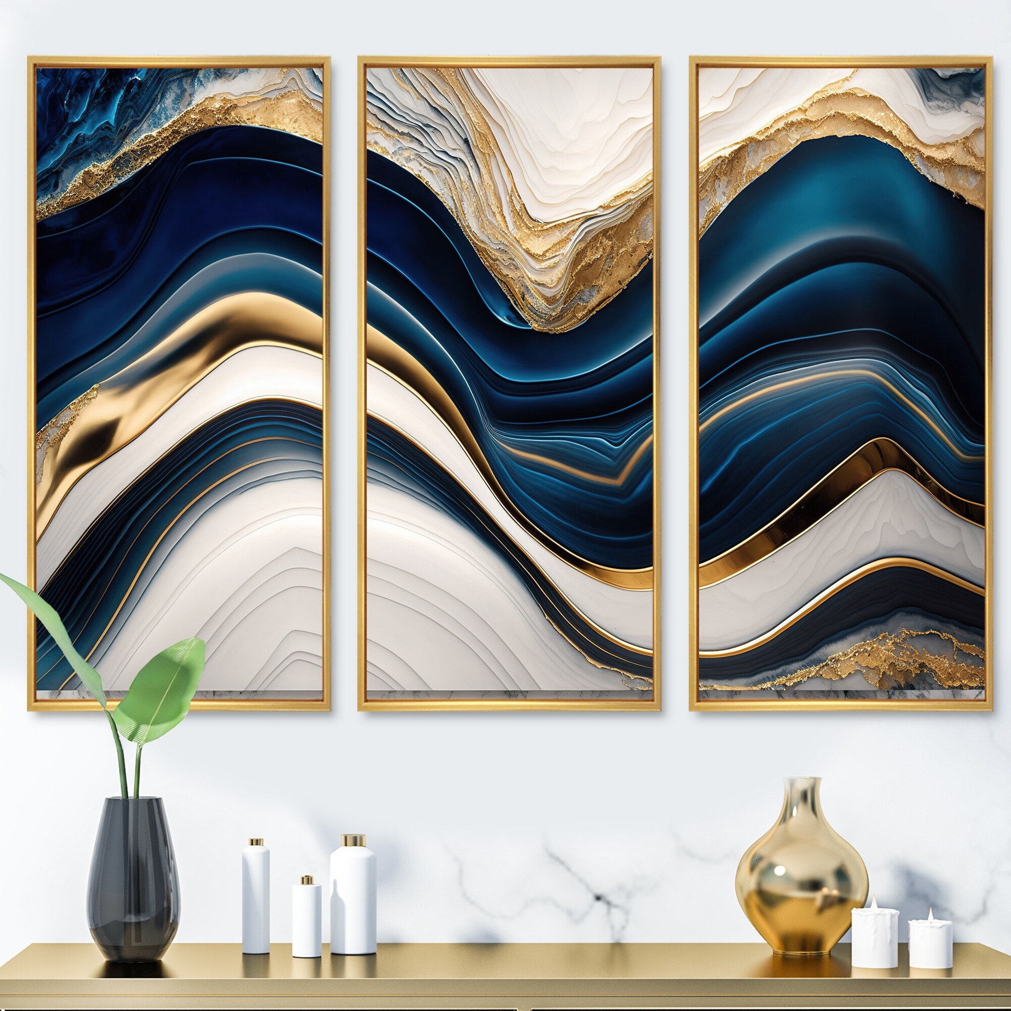 Designart "Abstract Geode Waves Blue And Gold III" Modern Waves Framed Canvas Art Print - 3 Panels