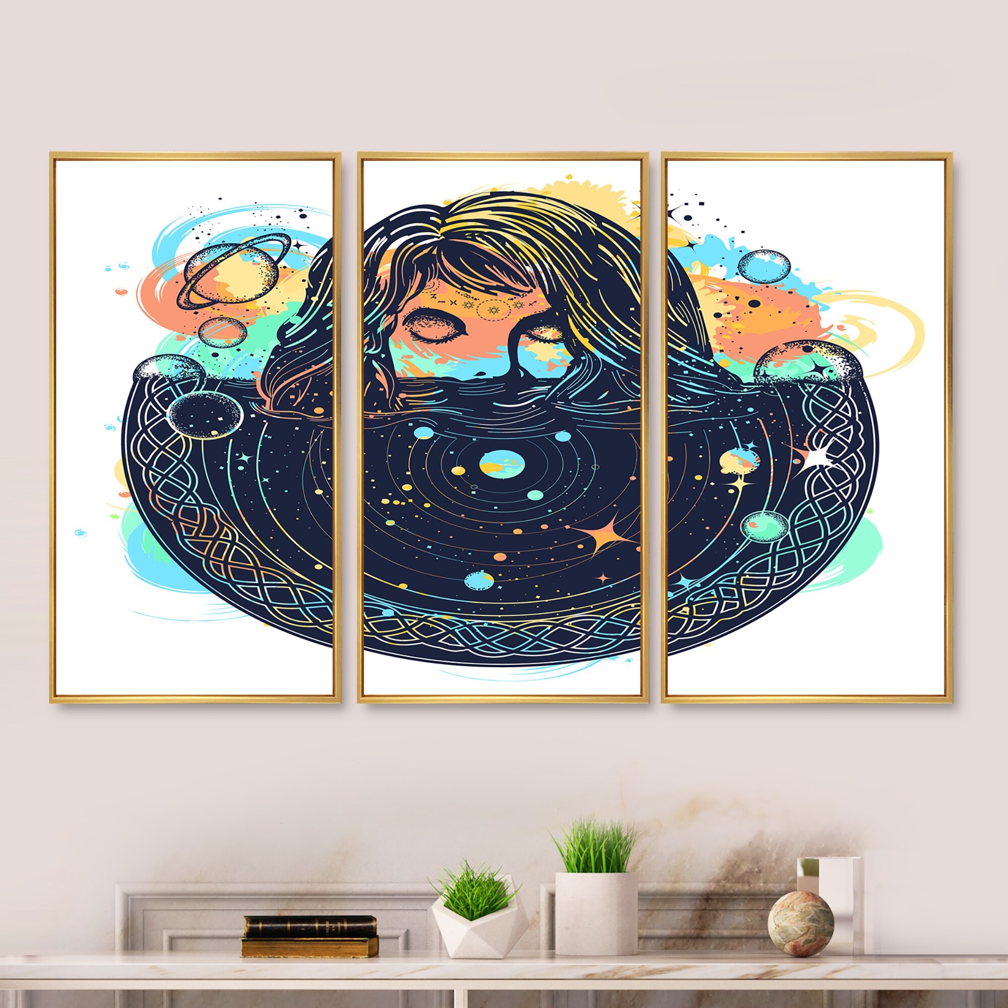 Designart "Surreal Girl in Space" Modern Framed Canvas Wall Art Print Set of 3 - 4 Colors of Frames