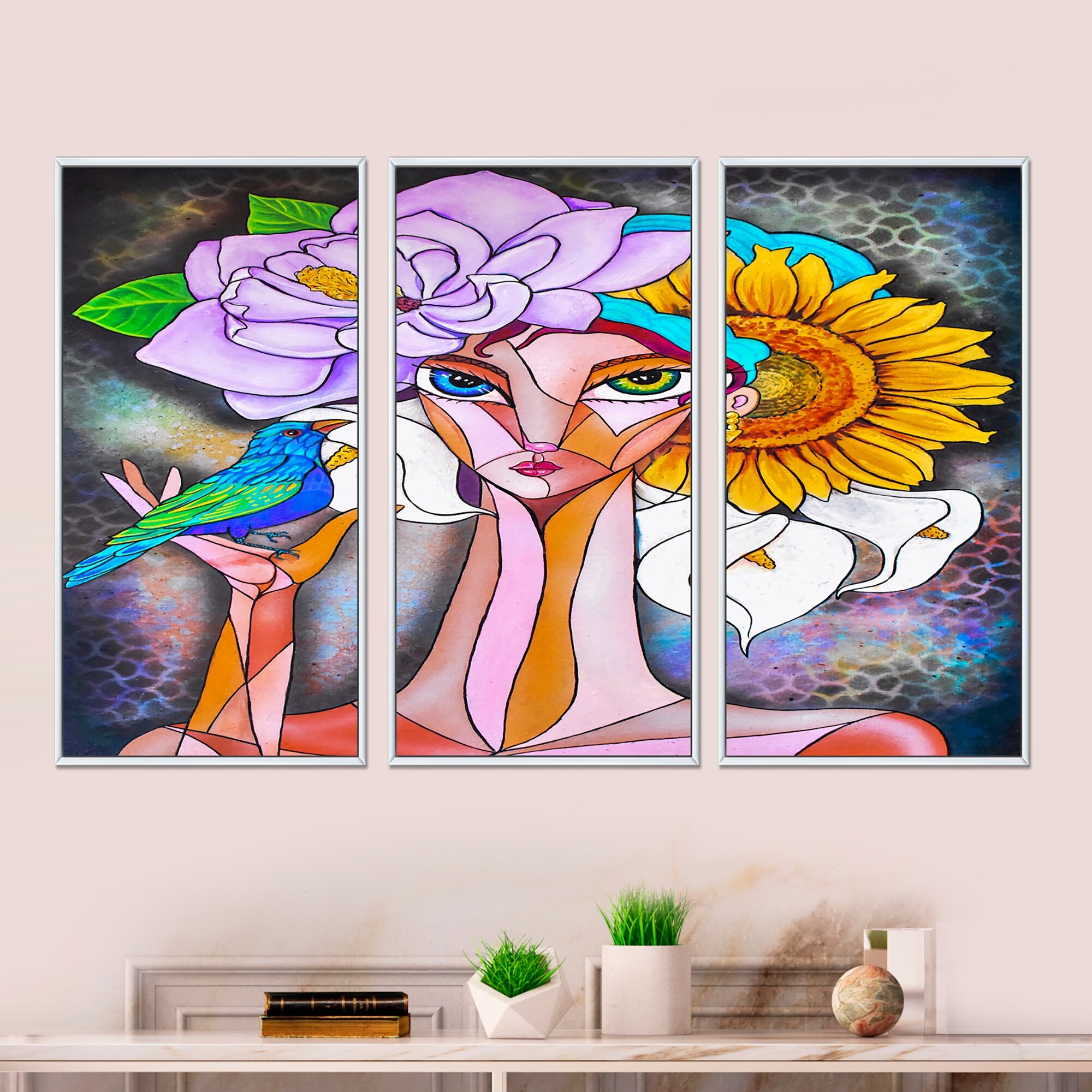 Designart "Modern Cubist Portrait of Girl I" Glam Framed Art Prints Set of 3 - 4 Colors of Frames