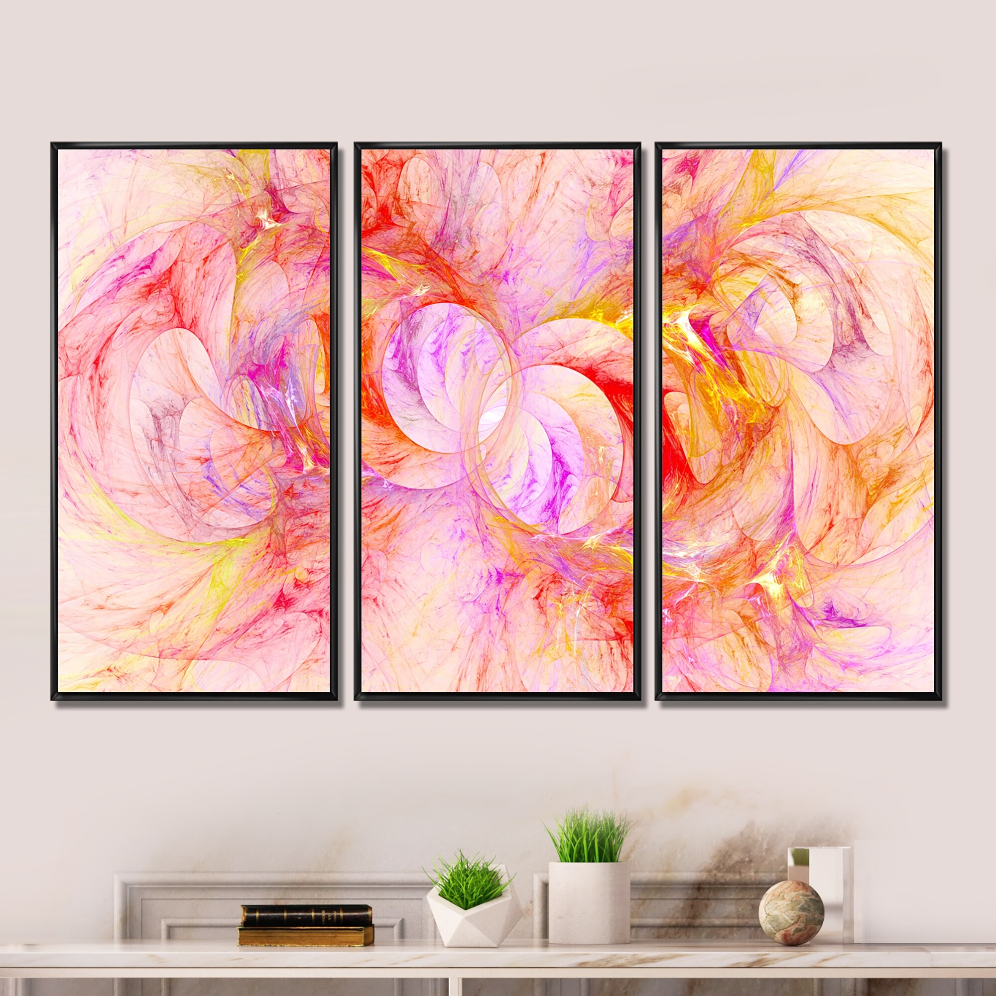 Designart "Red Yellow Fractal Glass Texture" Abstract Framed Art Set of 3 - 4 Colors of Frames
