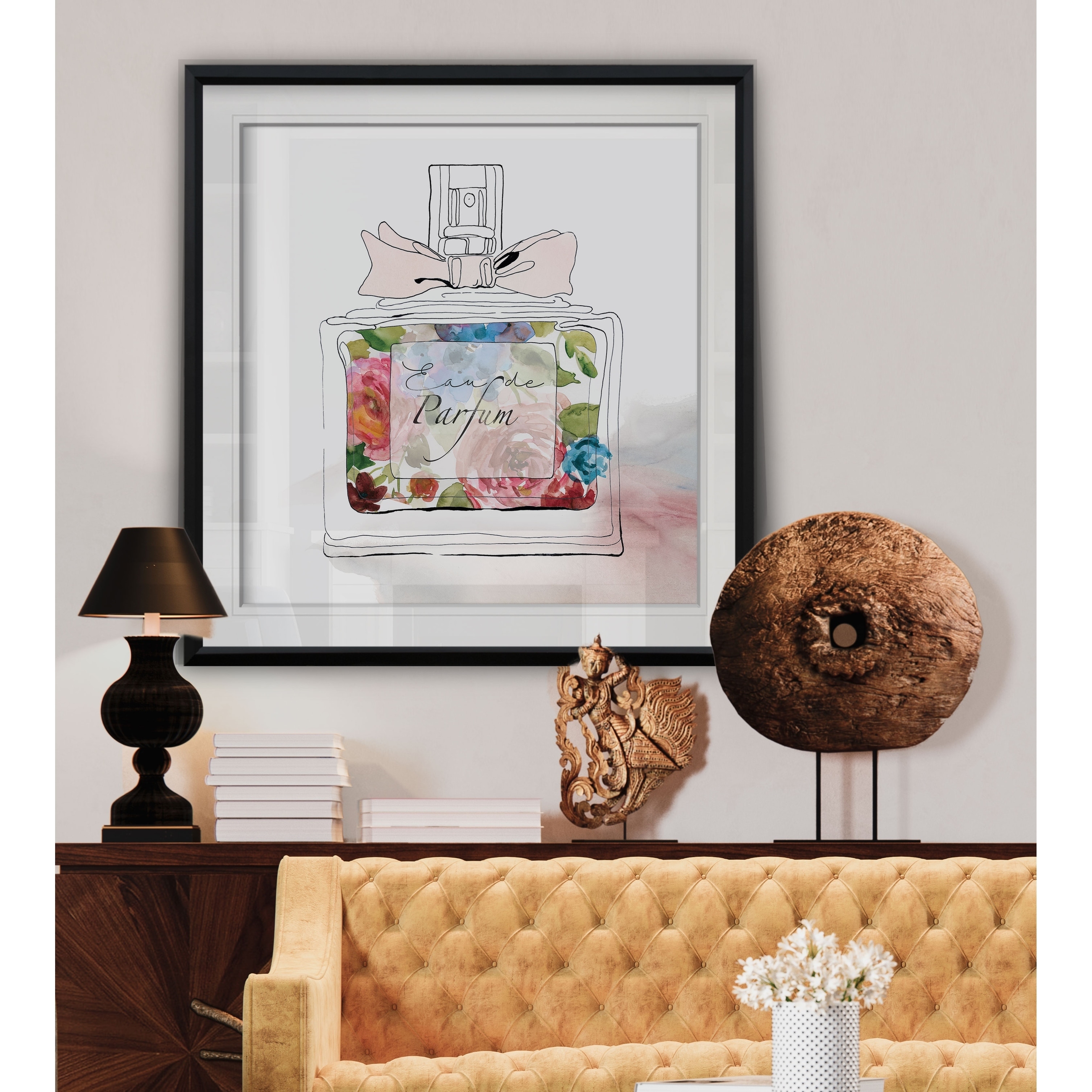 Chic Flower Perfume I -Custom Framed Print - blue, white, grey, yellow, green, silver, gold