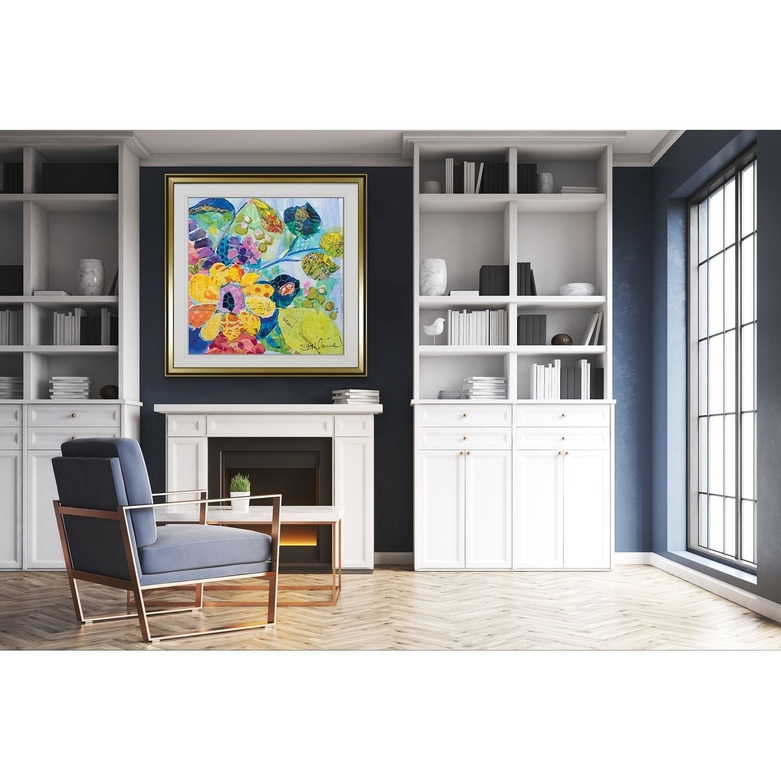 Bold Blooms VI -Custom Framed Print - blue, white, grey, yellow, green, silver, gold