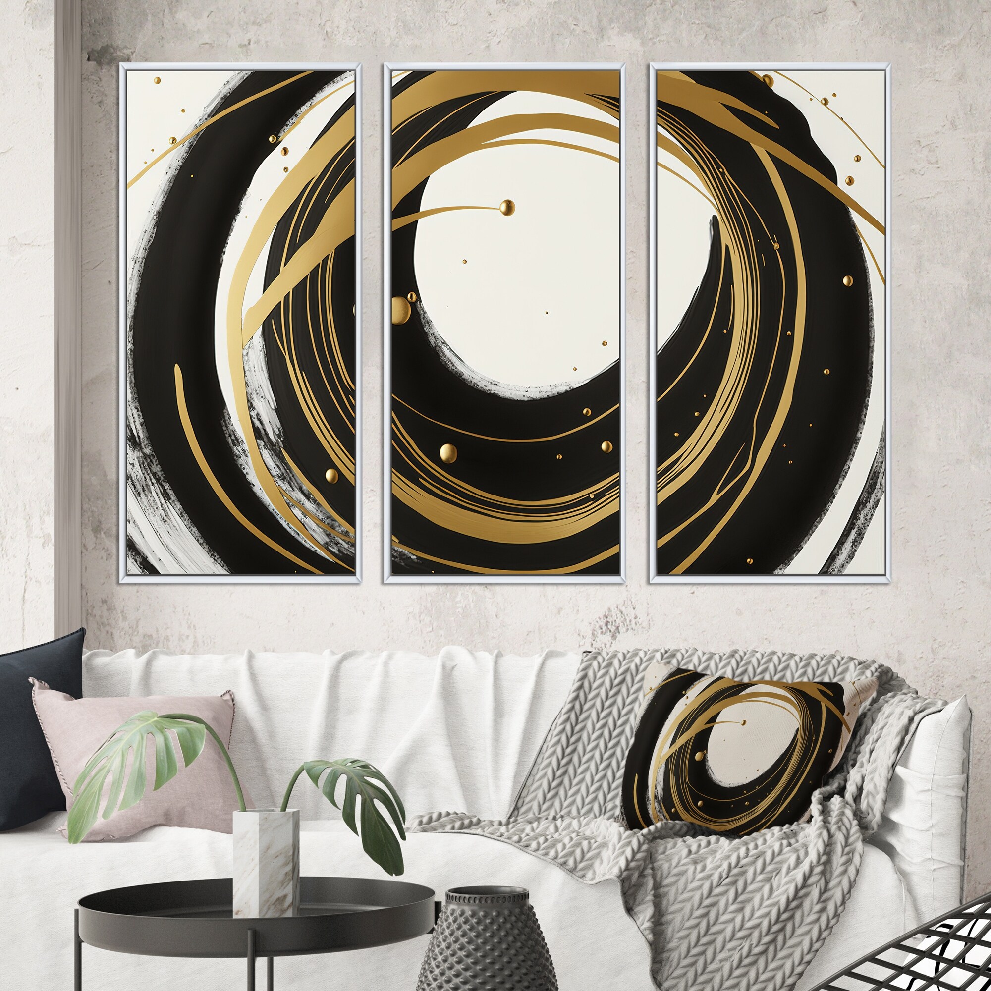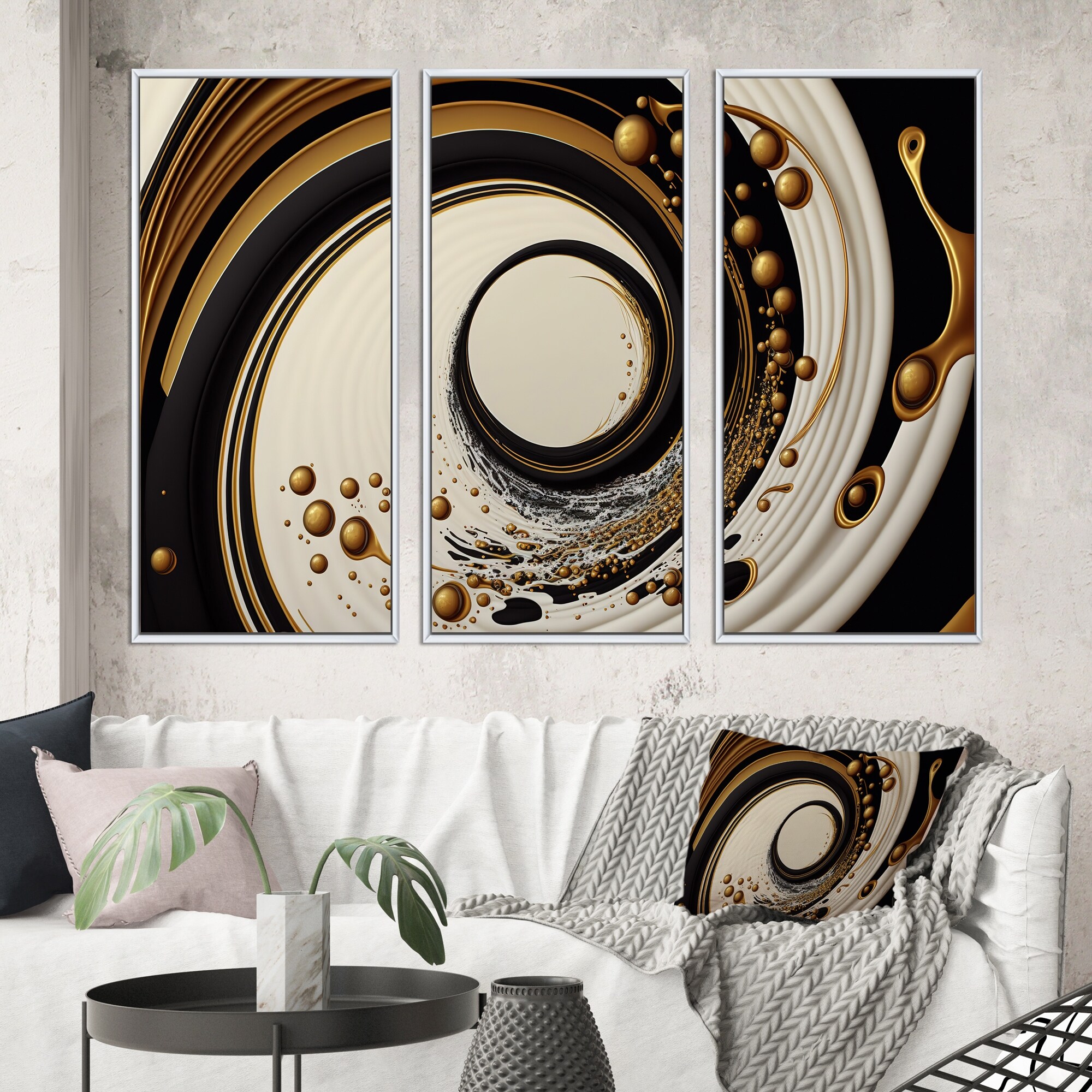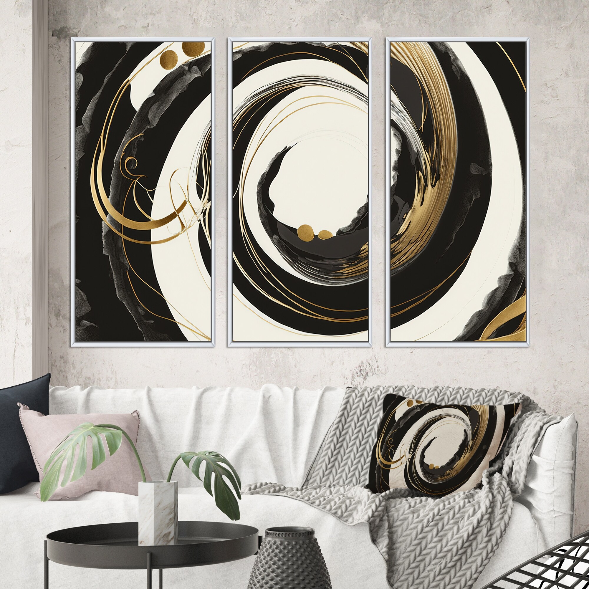 Designart "Black, Silver And Gold Blending Swirls IV" Modern Spiral Framed Canvas Art Print - 3 Panels
