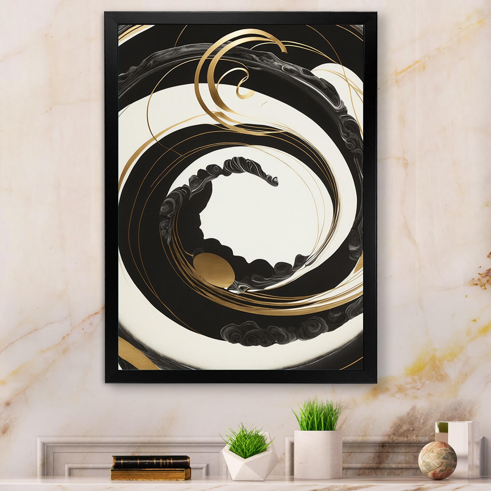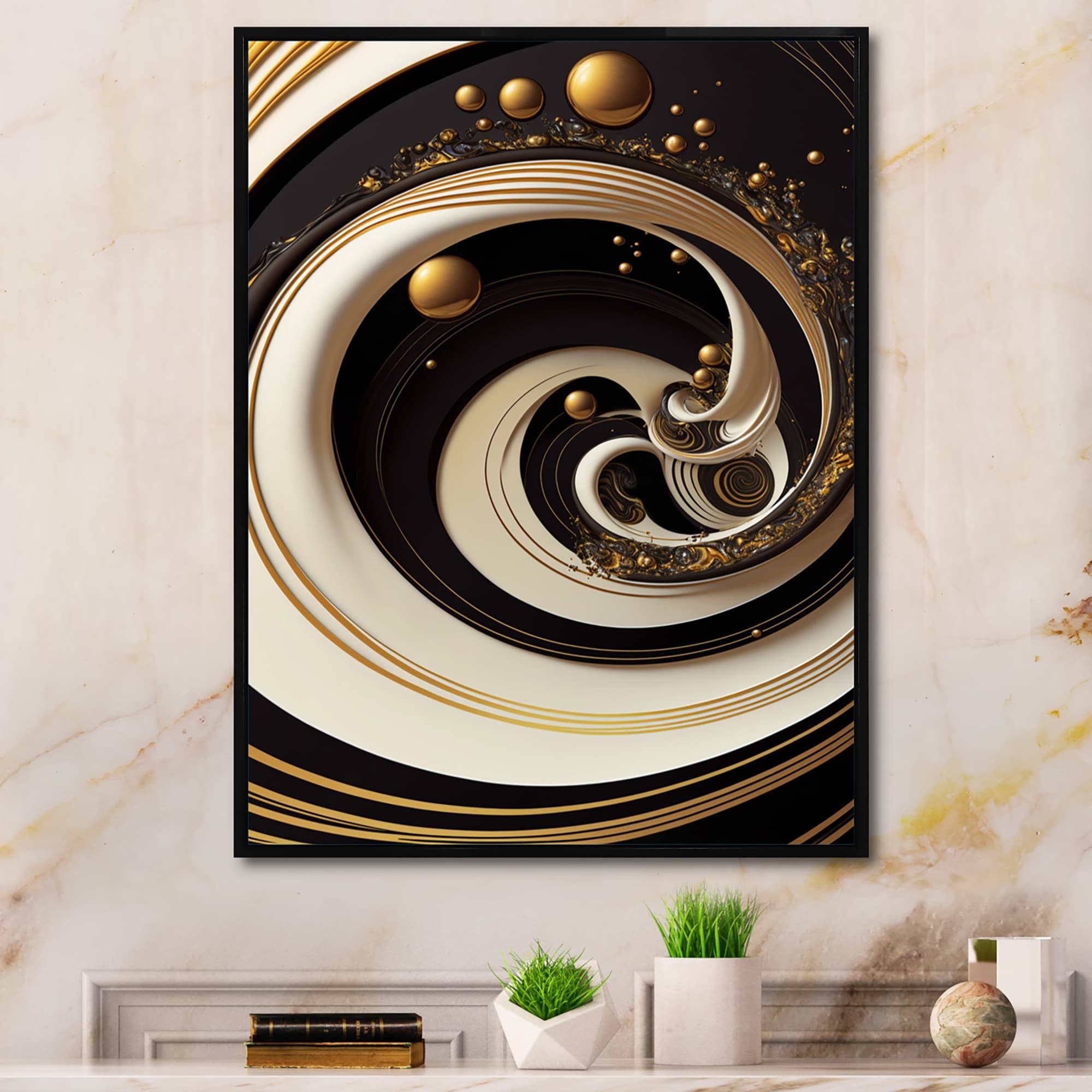 Designart "Black, Silver And Gold Blending Swirls VII" Modern Framed Canvas Art Print
