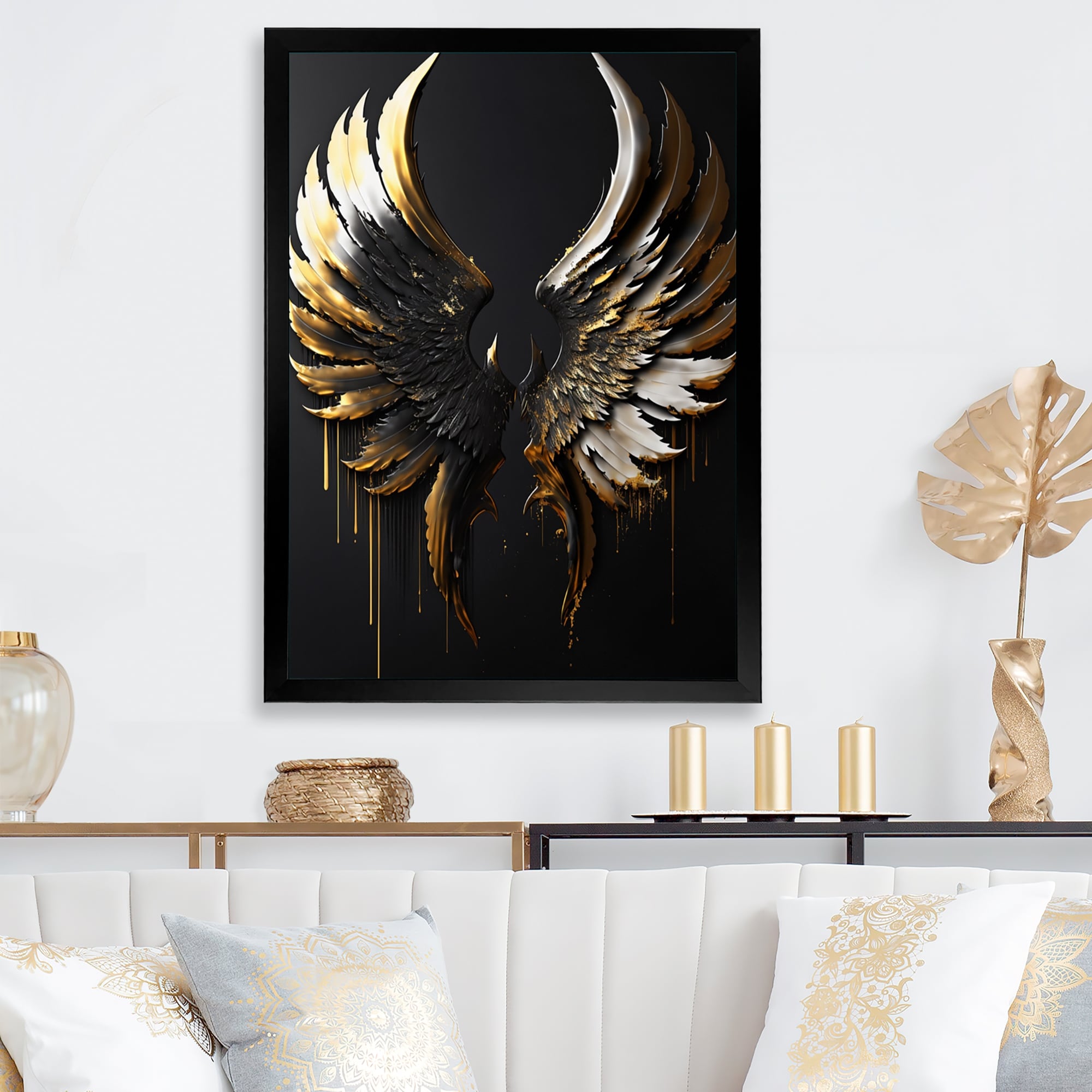 Designart "Black Silver And Gold Angel Wings II" Contemporary Glam Framed Art Print