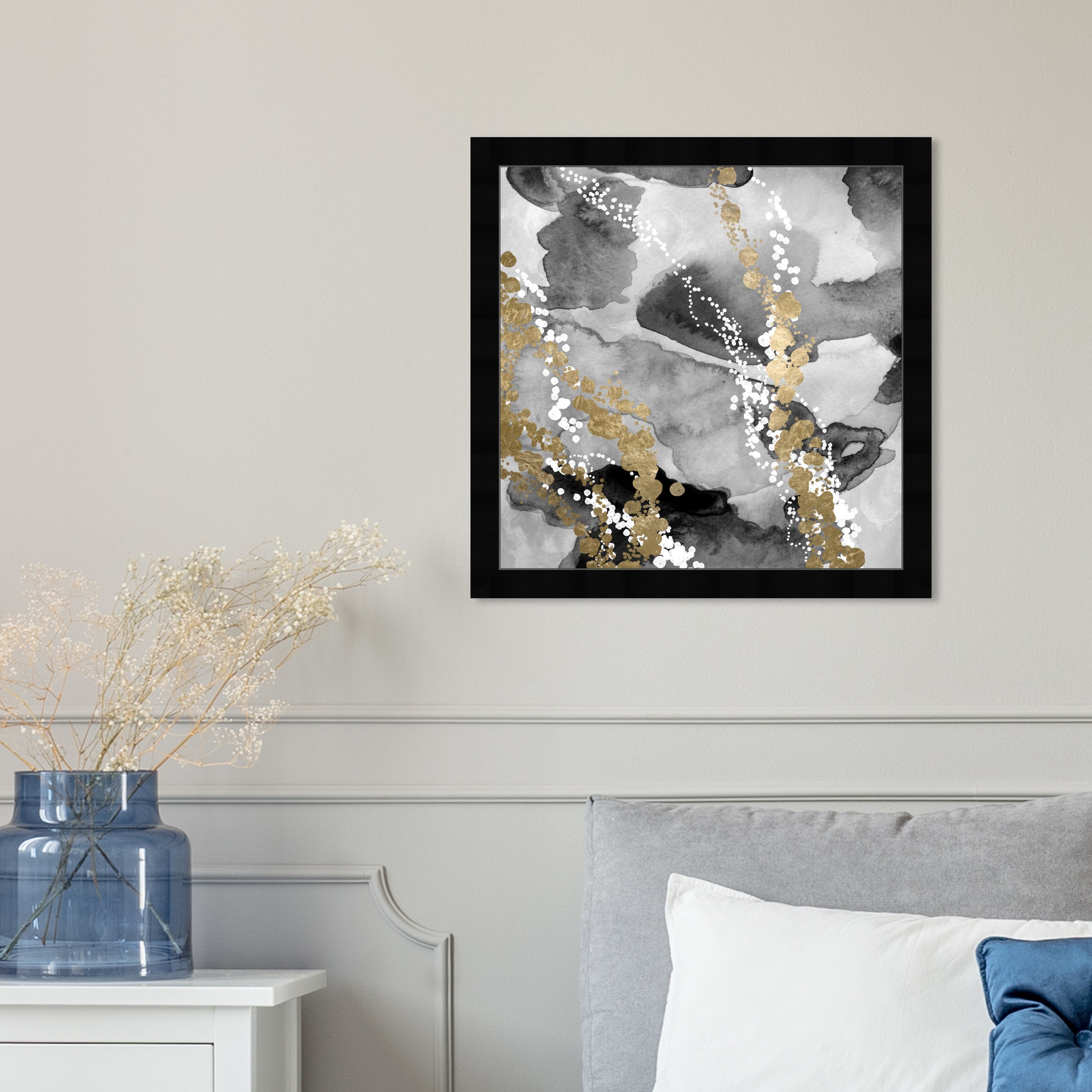 Black and Bloom IV -Custom Framed Print - blue, white, grey, yellow, green, silver, gold