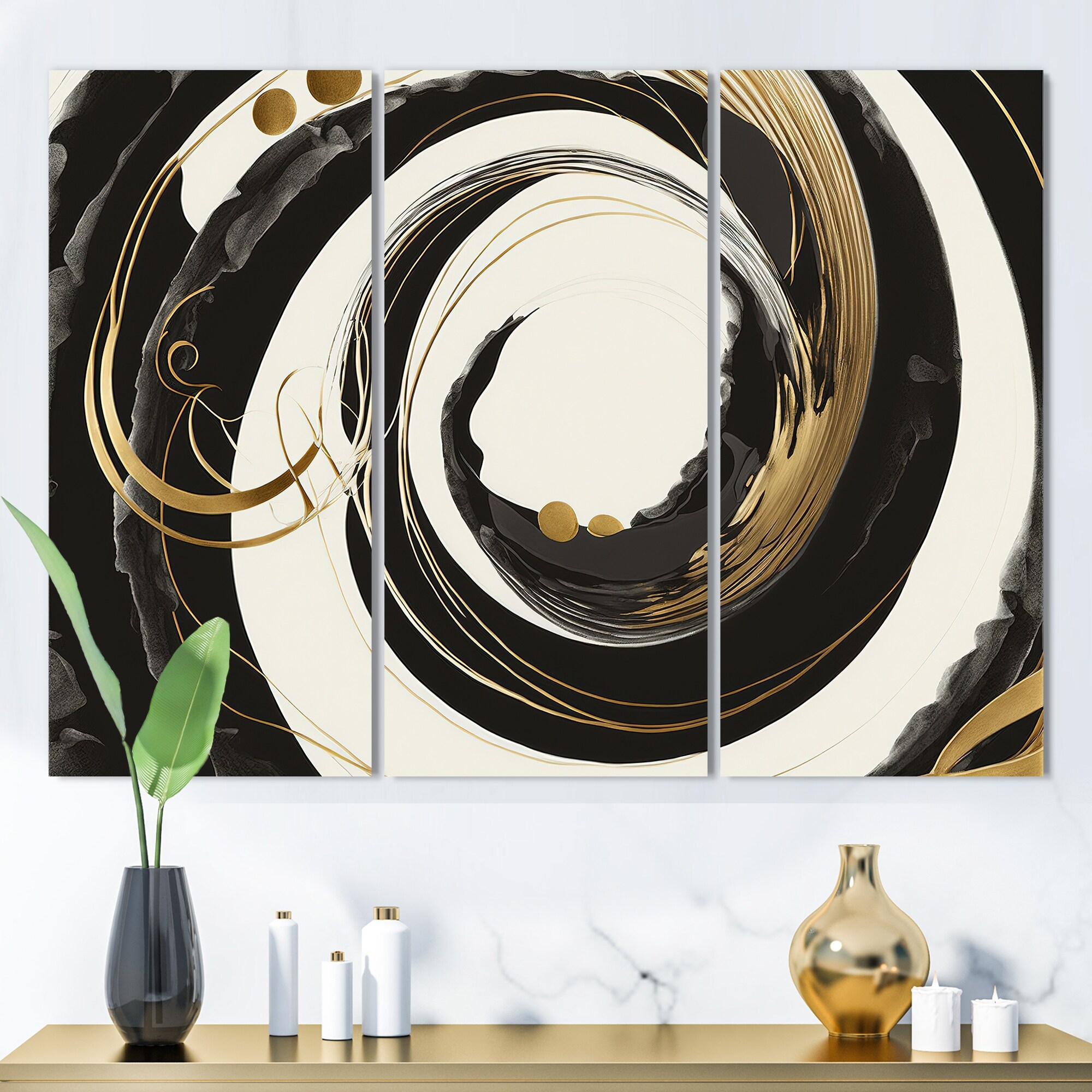 Designart "Black, Silver And Gold Blending Swirls II" Modern Spiral Canvas Art Print - 3 Panels