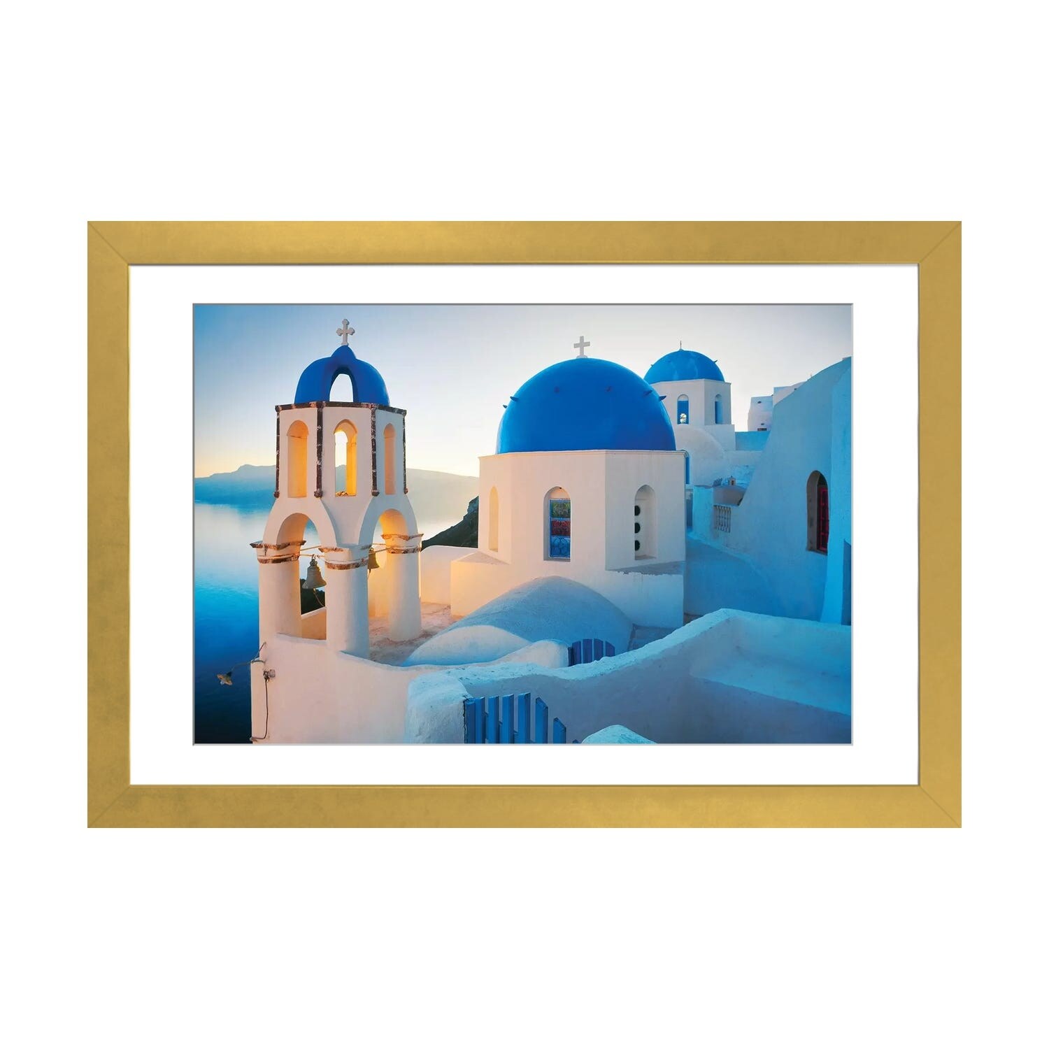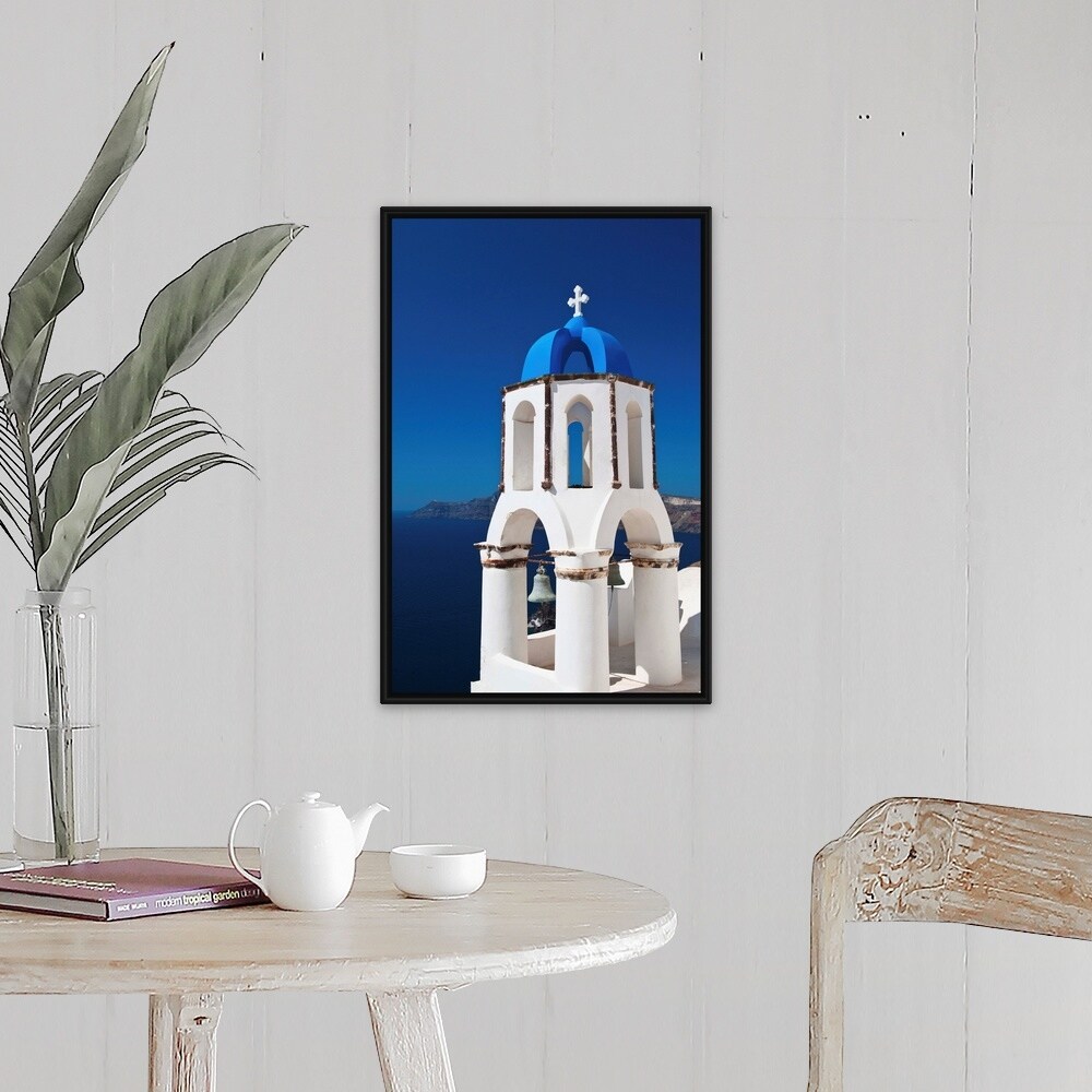 "Greece, Cyclades Islands, Santorini, Oia, Church bell tower at coast" Black Float Frame Canvas Art
