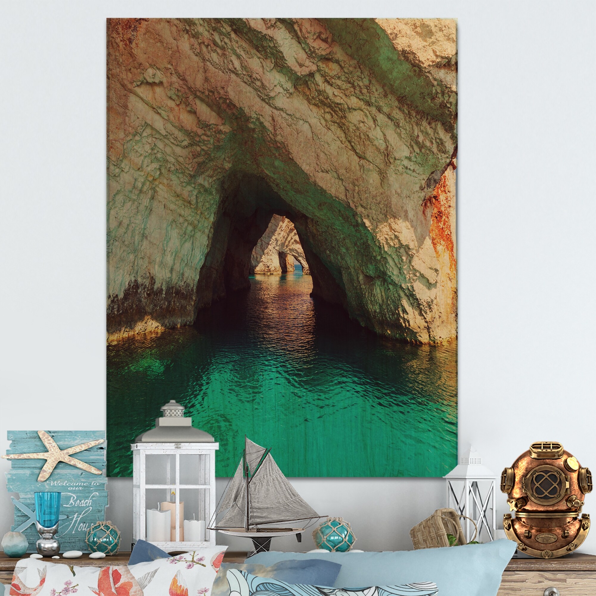 Designart 'Beautiful Sea Cave in Greece' Nautical & Coastal Wood Wall Art Décor - Natural Pine Wood