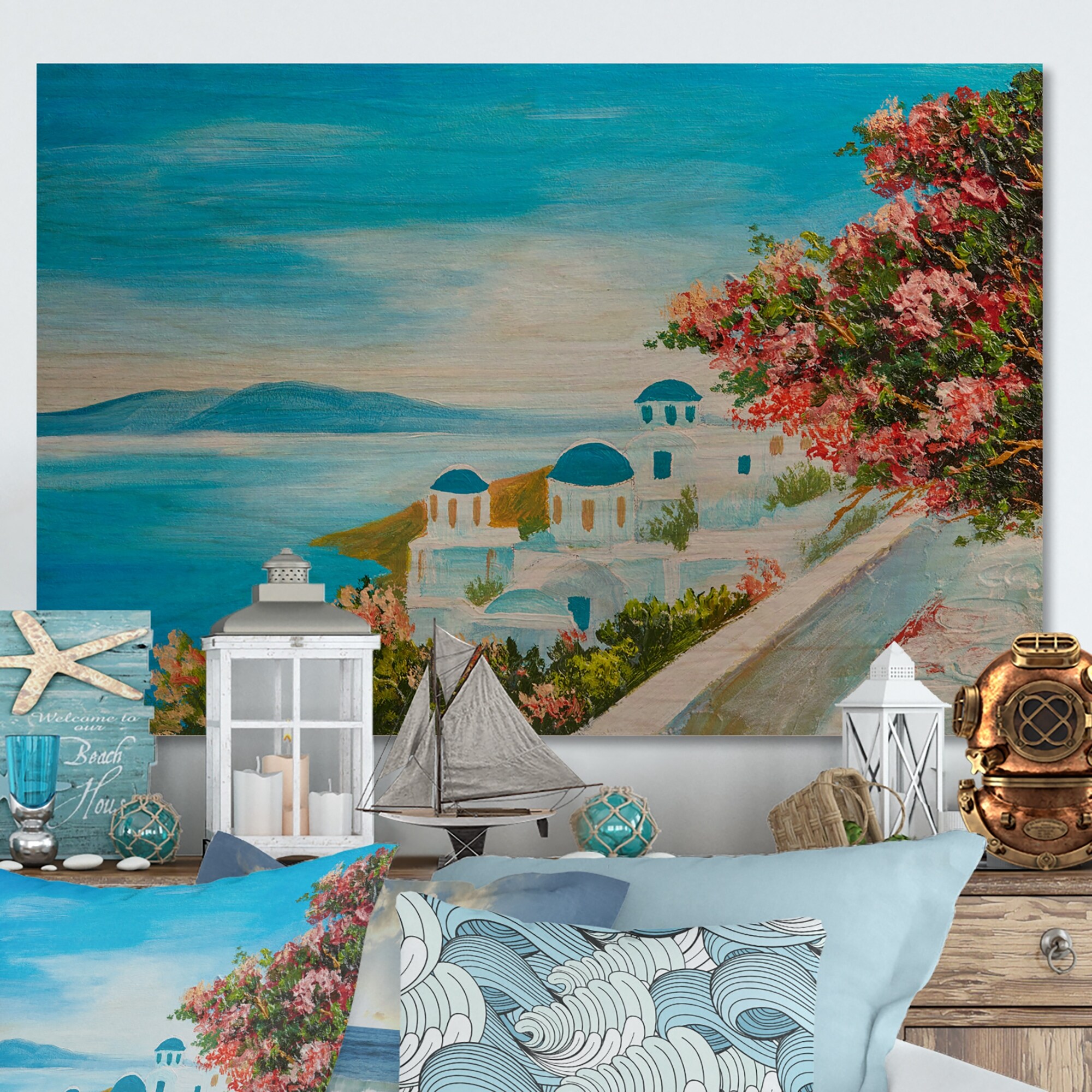 Designart 'Beautiful Greece Coastal Landscape II' Nautical & Coastal Wood Wall Art Panels - Natural Pine Wood