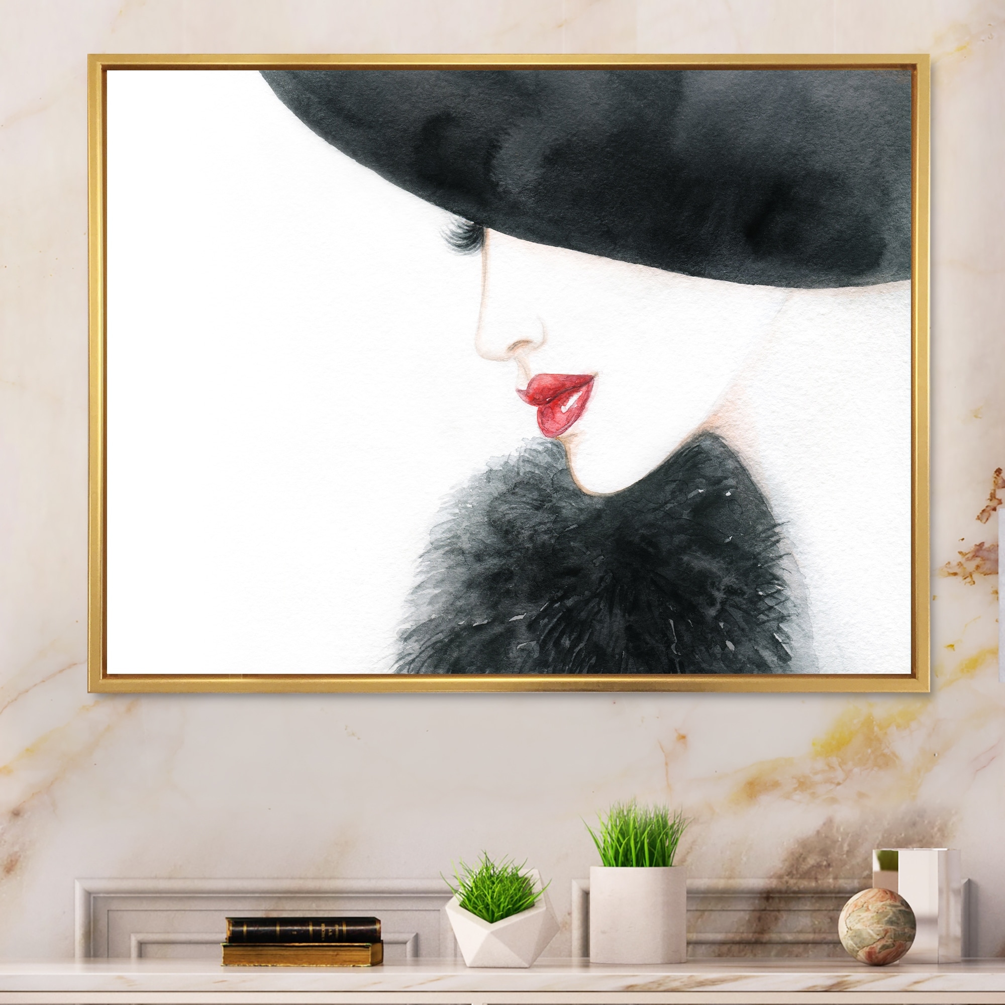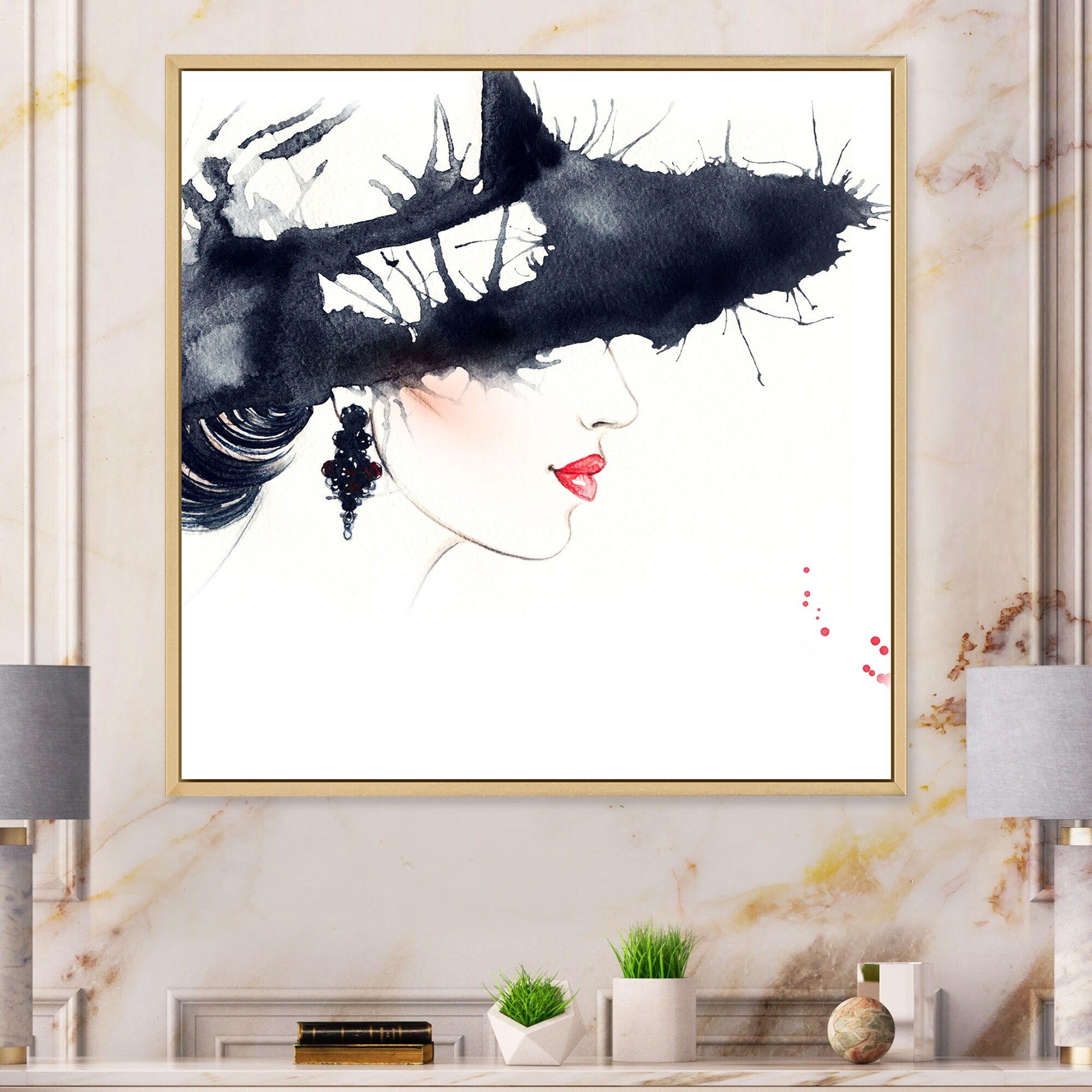 Designart "Elegant Fashion Woman With Black Hat" Glam Framed Canvas artwork