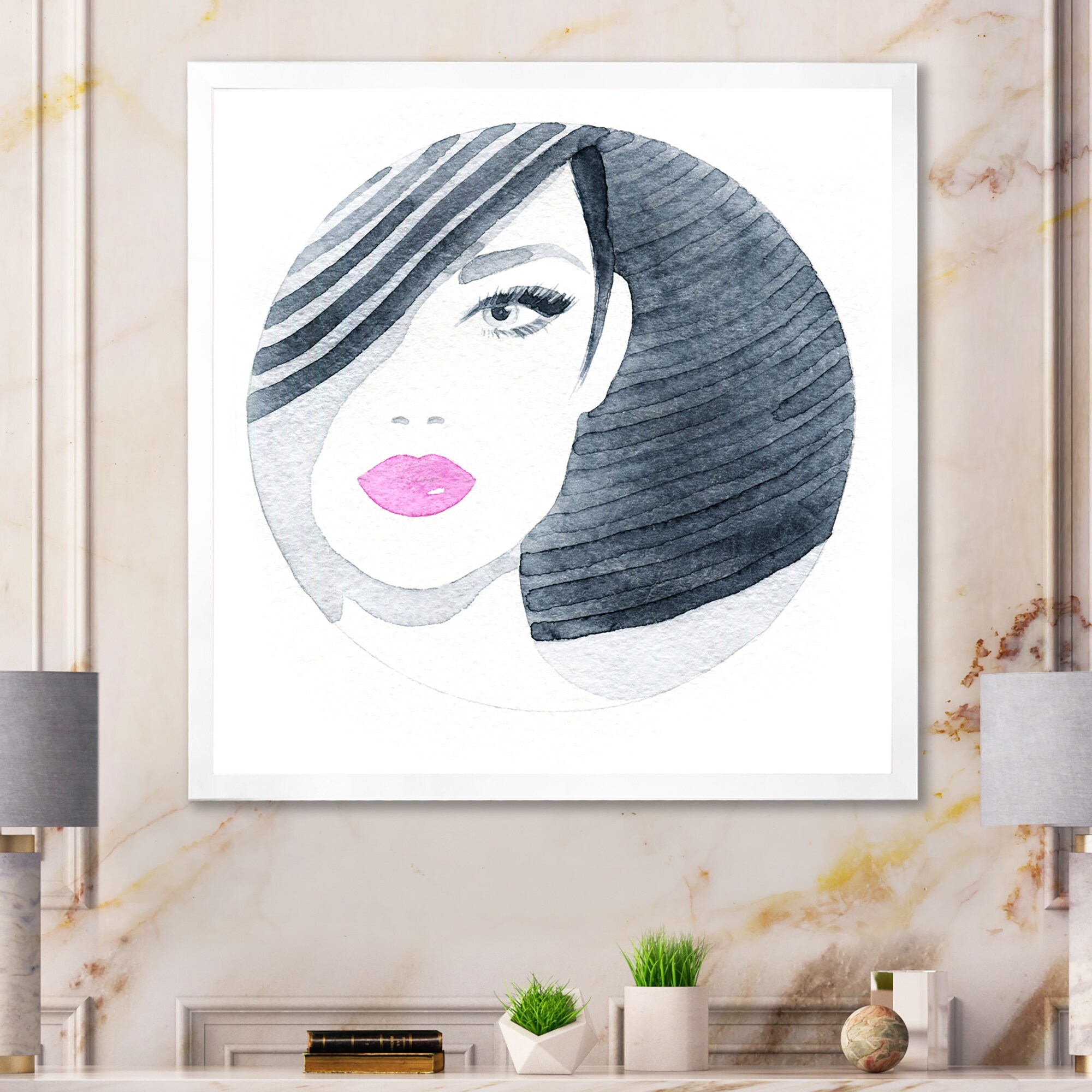 Designart "Fashionista With Striped Hat And Pink Lips" Glam Framed Wall Art