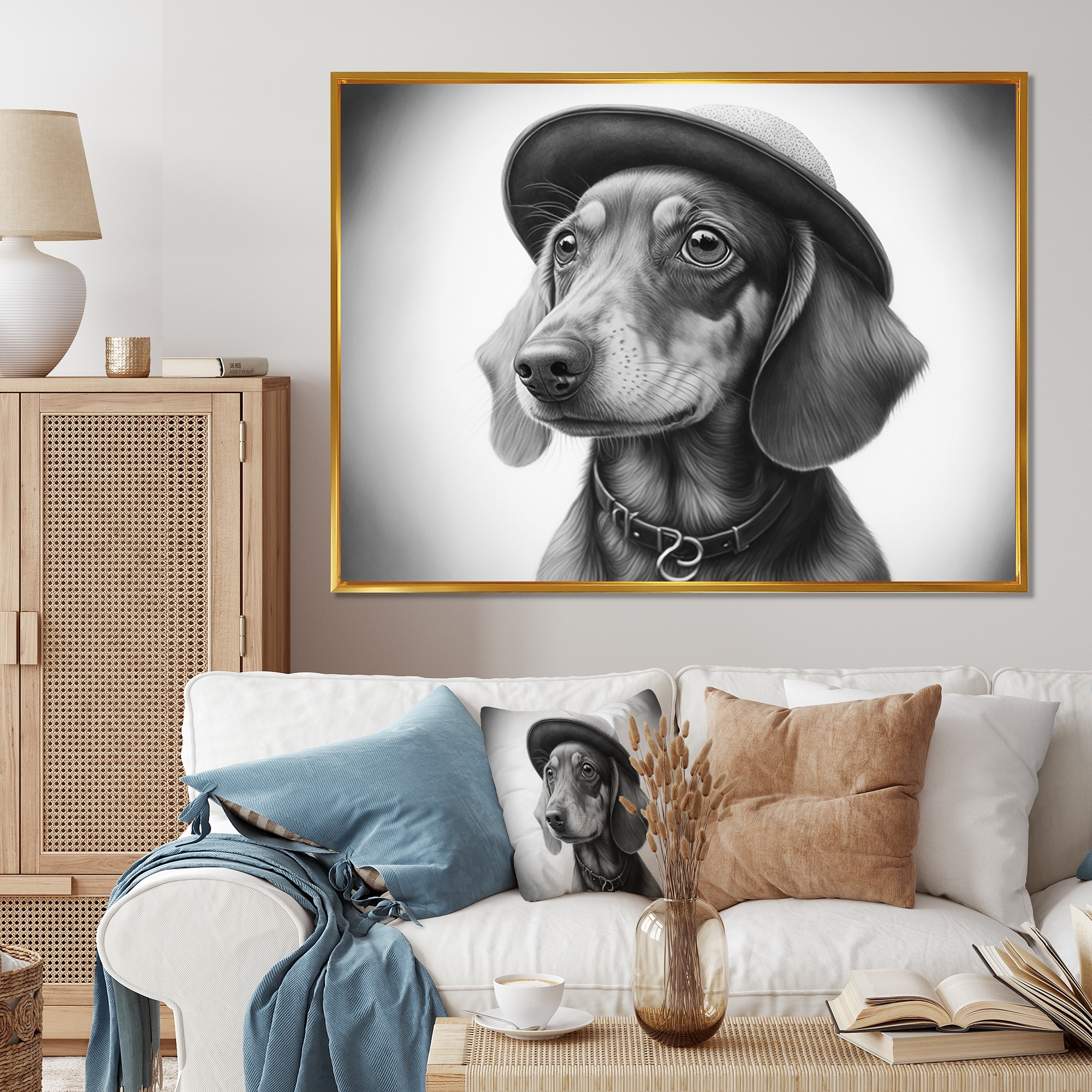Designart "Black And White Dachshund With A Hat" Animals Framed Canvas Wall Art Print